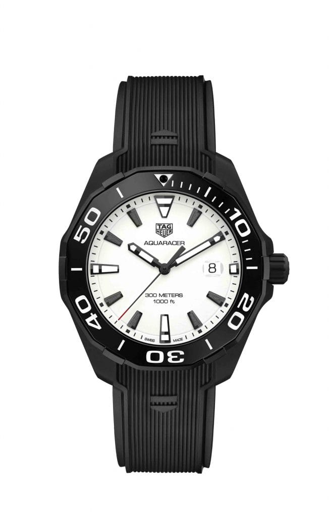 Montre à quartz, TAG Heuer Aquaracer avec boitier 43 mm, cadran blanc en Superluminova, aiguilles facettées et polies, dotées de marqueurs luminescents, bracelet caoutchouc noir avec boucle déployante, boutons poussoirs de sécurité et extension pour la plongée.