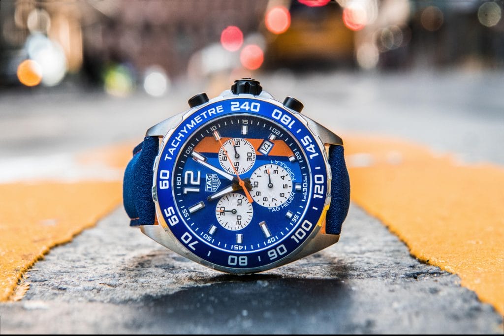 Deux modèles phares des collections TAG Heuer qui reprennent les couleurs mythiques de Gulf, le orange le bleu. TAG Heuer Formula 1 est le modèle automobile par excellence, synonyme de performance et de vitesse. Tout en acier, d’un diamètre de 43mm, ce chronographe à quartz arbore une lunette crantée en acier et bague aluminium avec échelle de tachymètre. Sur le cadran, une bande bleue et une bande orange rappellent les origines du modèle. Le fond de la boîte est quant à lui gravé du logo Gulf. La précision au dixième de seconde du mouvement, élément indispensable pour une montre de course automobile, est portée sur le petit compteur à 6 heures, le compteur des minutes est à 9 heures et celui des secondes courantes est à 3 heures. Ce modèle est présenté avec un très beau bracelet en cuir bleu effet asphalt, avec surpiqûres oranges, pour un look sportif et racé.