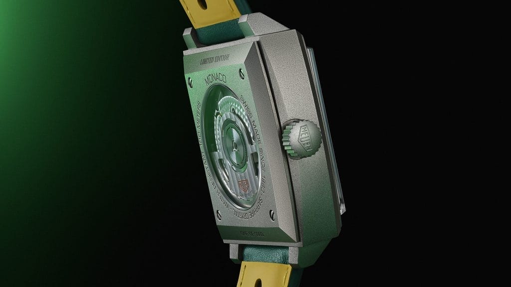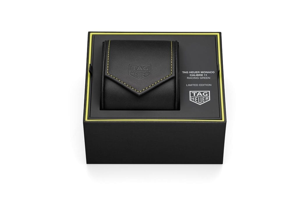 La TAG Heuer Monaco Chronograph Racing Green est une édition limitée, ainsi l’inscription “ONE OF 1000” est gravée sur le fond du boitier. Elle est présentée dans un écrin noir pensé spécialement pour l’occasion et rehaussé de détails jaune vif.