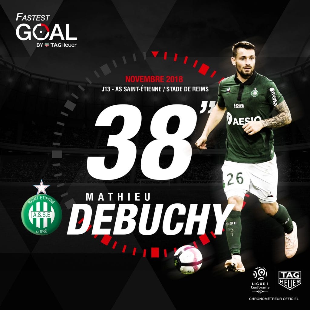 TAG Heuer remet le Trophée « Fastest Goal » du mois de Novembre à Mathieu Debuchy. Le défenseur de l’AS Saint-Etienne a ouvert le score à la 38ème seconde du match opposant son club au Stade de Reims. Pour rappel, l’horloger Suisse a créé le « Fastest Goal » lors de la saison 2017-2018 de Ligue 1 Conforama, afin de récompenser, tous les mois, les joueurs s’illustrant en marquant un but le plus rapidement lors d’un match de championnat. TAG Heuer récompense également la meilleure performance de l’année ce qui a permis à Julio Tavares de recevoir le prix pour la saison 2017-2018 grâce à son but marqué en 29 secondes.