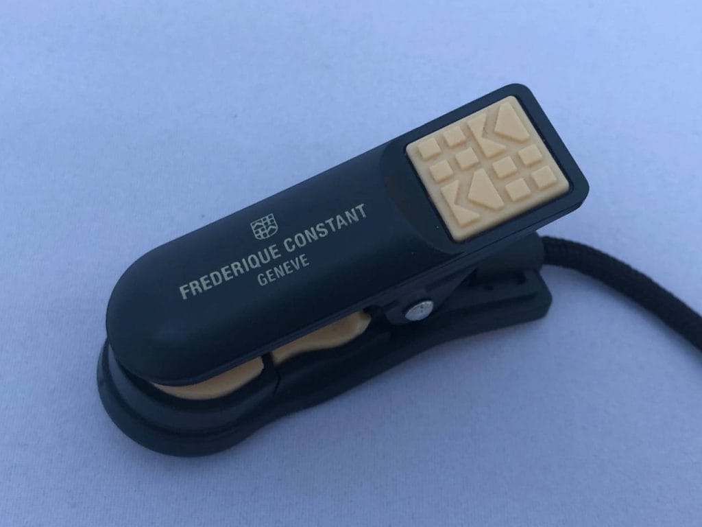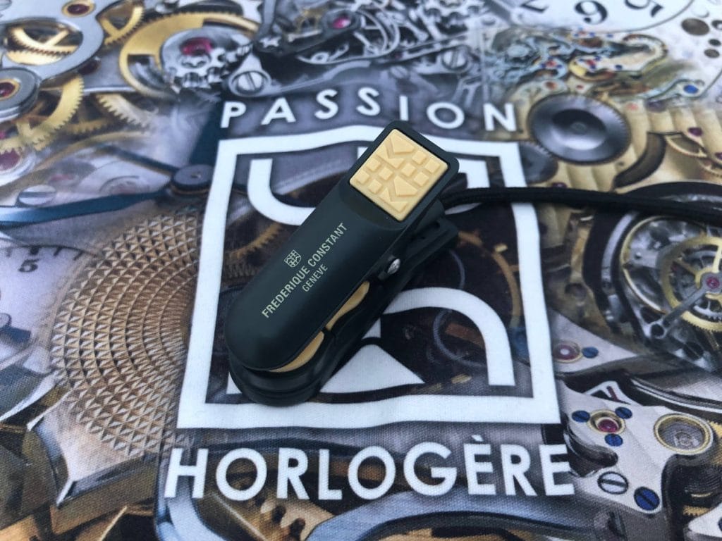 Cet accessoire, en forme de petite pince venant se poser sur une montre mécanique, sert à mesurer la précision de la montre ainsi « analysée ». Il s’agit d’un « Clip Analytics » signé Frédérique Constant, d’une valeur unitaire de 129 €.