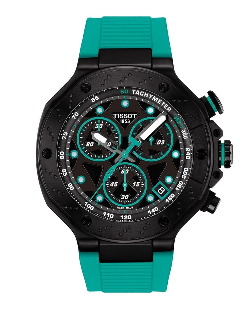 Après les éditions MotoGP™, la T-Race Chronographe à quartz se décline en deux nouvelles teintes audacieuses : vert turquoise et orange, contrastant avec un boîtier en PVD noir. Associant design percutant et précision suisse, ces modèles de 45 mm ajoutent une touche vibrante à la collection.