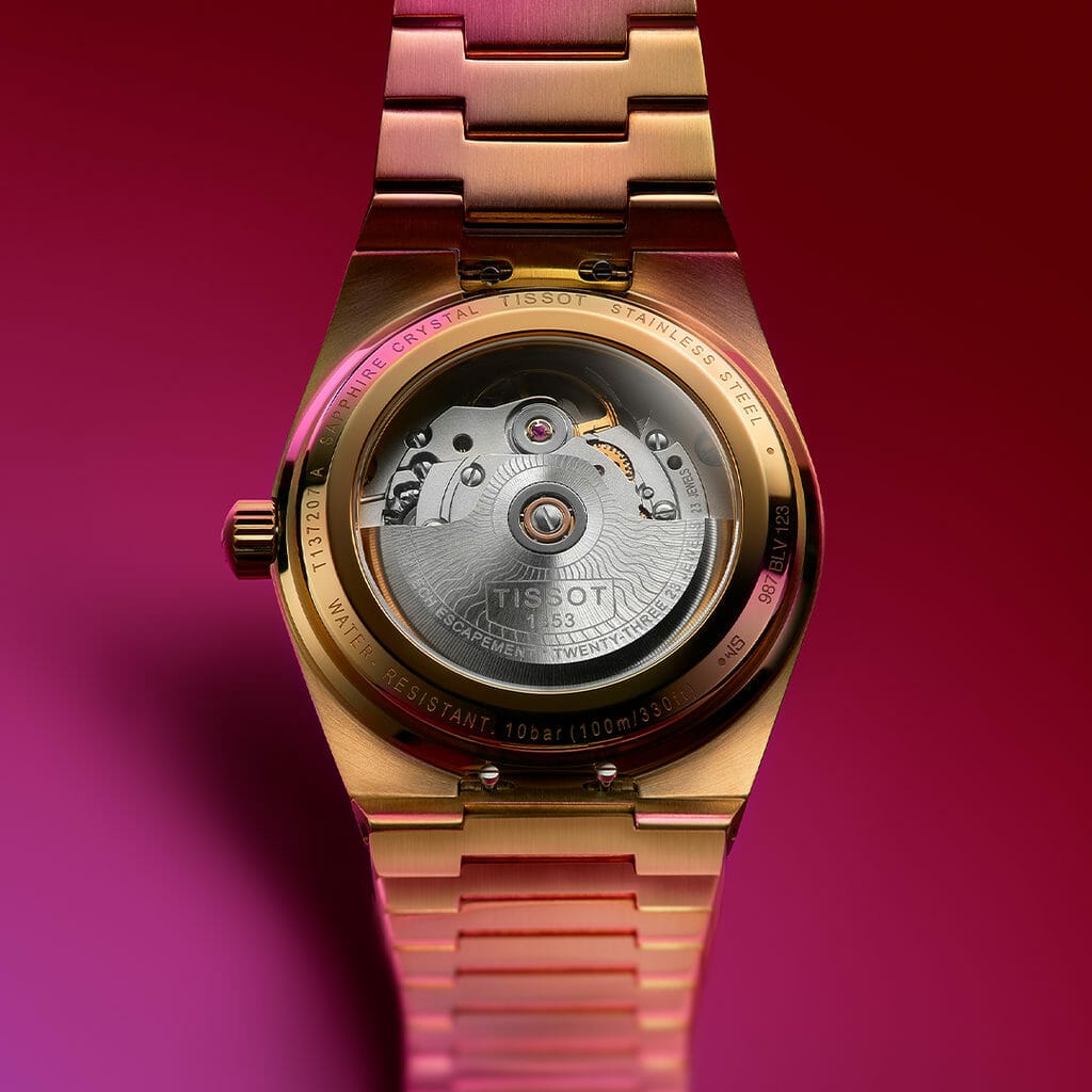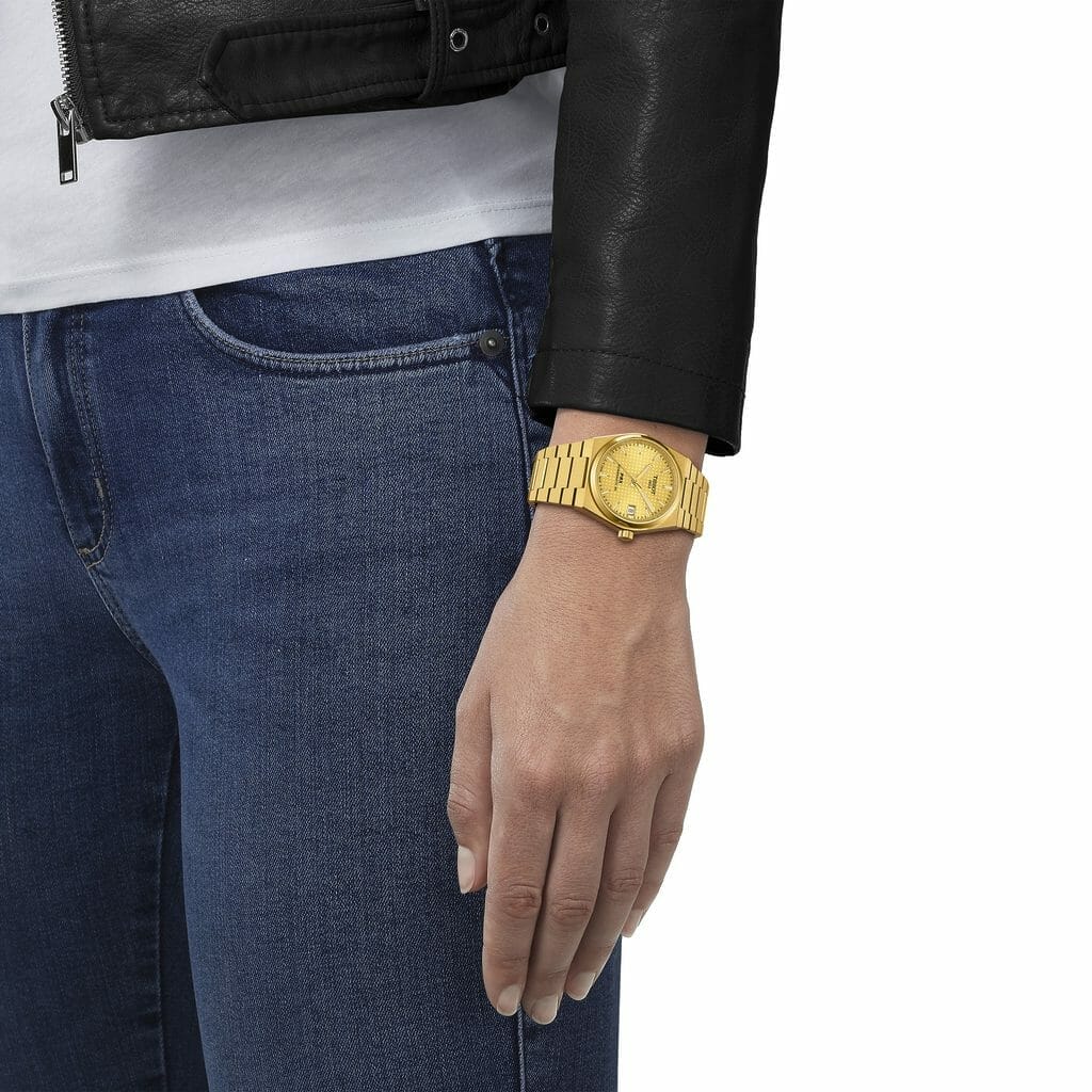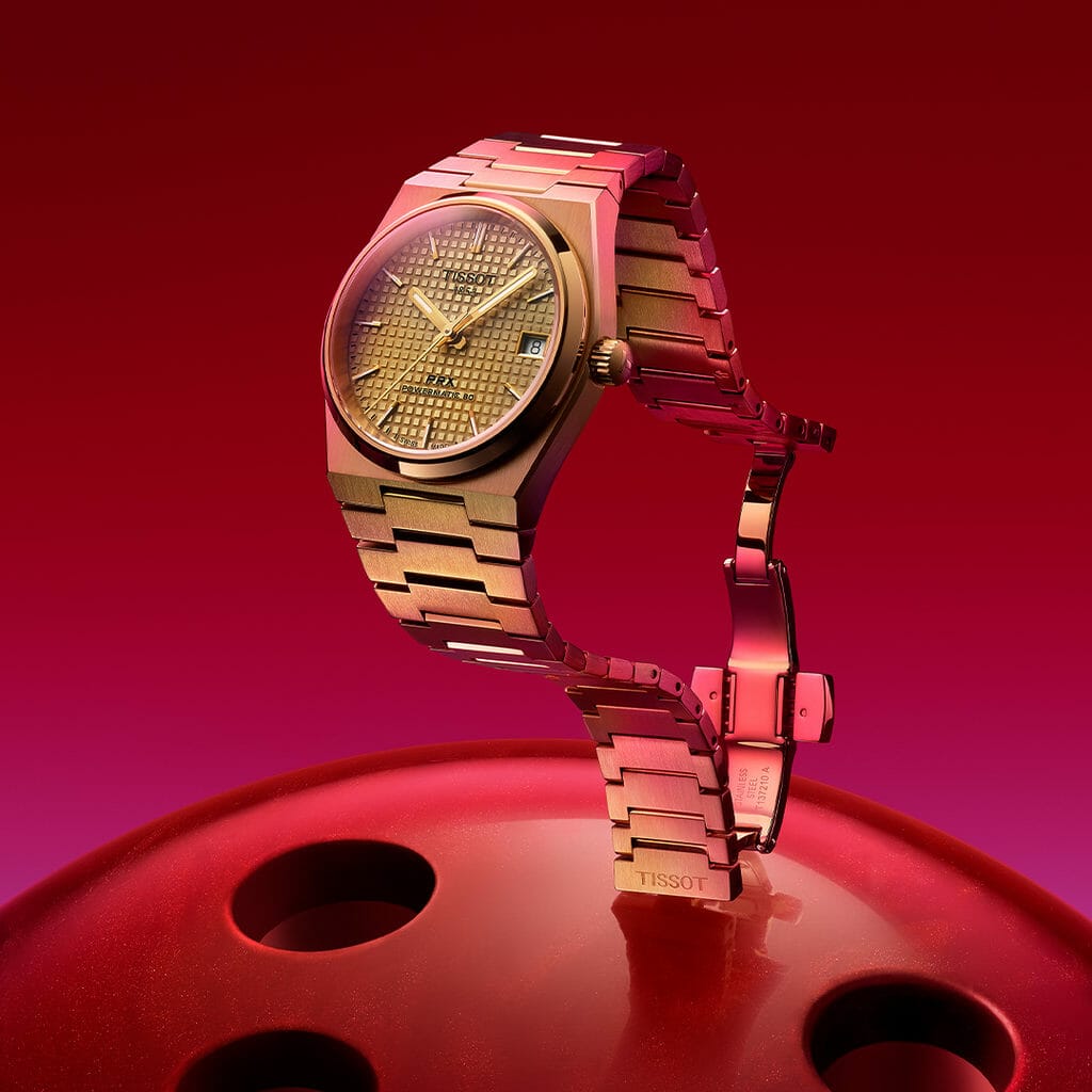 Lumineuse, notre PRX 35 mm Powermatic 80 bleu glacier resplendit telles les lueurs d’un matin d’hiver sur les Alpes, avec son cadran gaufré qui capte la lumière comme de la neige. Sa variante dorée, quant à elle, rend hommage à l’esprit disco des années 1970, ajoutant une touche indéniable d’audace au style de son propriétaire.