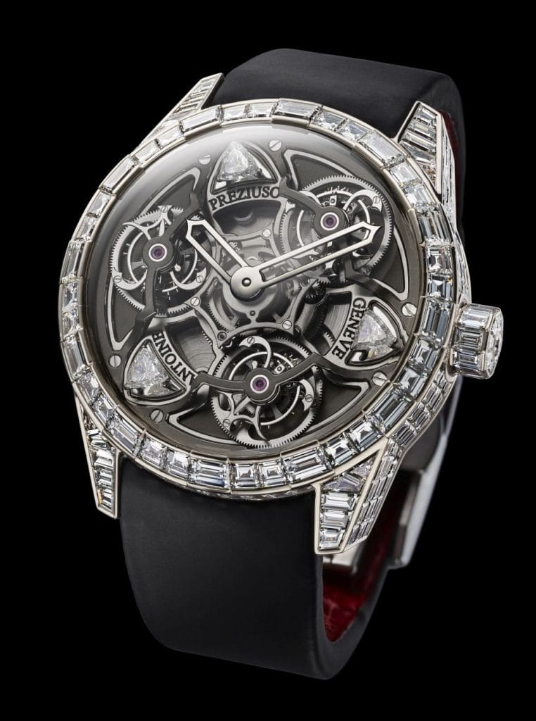 Le Trillion Tourbillon of Tourbillons offre une fascinante symphonie de lumières et démontre la capacité d´Antoine Preziuso à conjuguer Haute Horlogerie avec Haute Joaillerie.