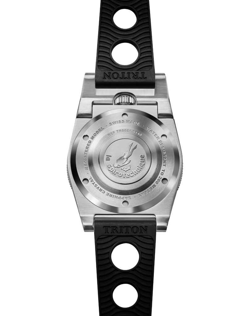 La Triton Spirotechnique reste fidèle à l’esprit de son design originel, conservant ses caractéristiques emblématiques telles que la position unique de la couronne à 12h et son célèbre protège-couronne articulé. Ce design distinctif, qui a fait la renommée de la marque, symbolise l’ADN des montres Triton depuis plus de six décennies.