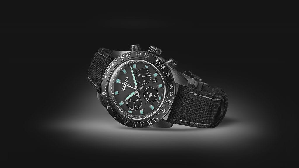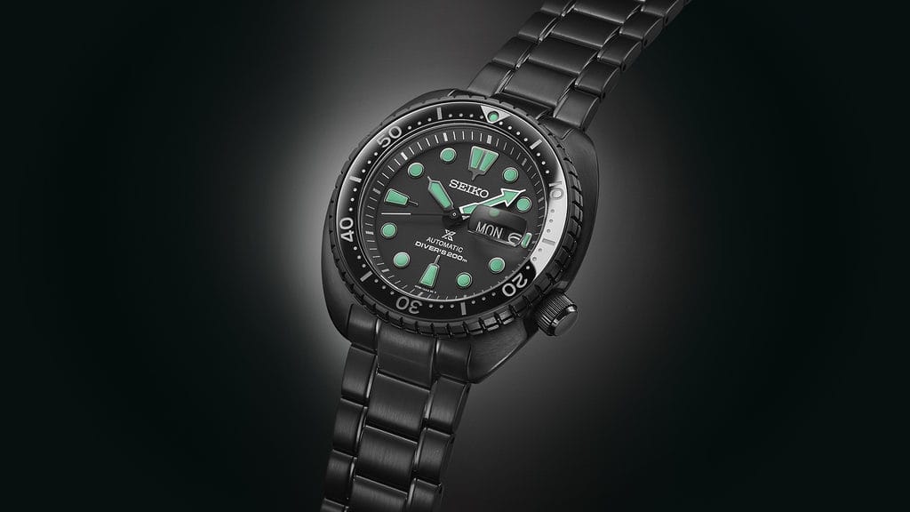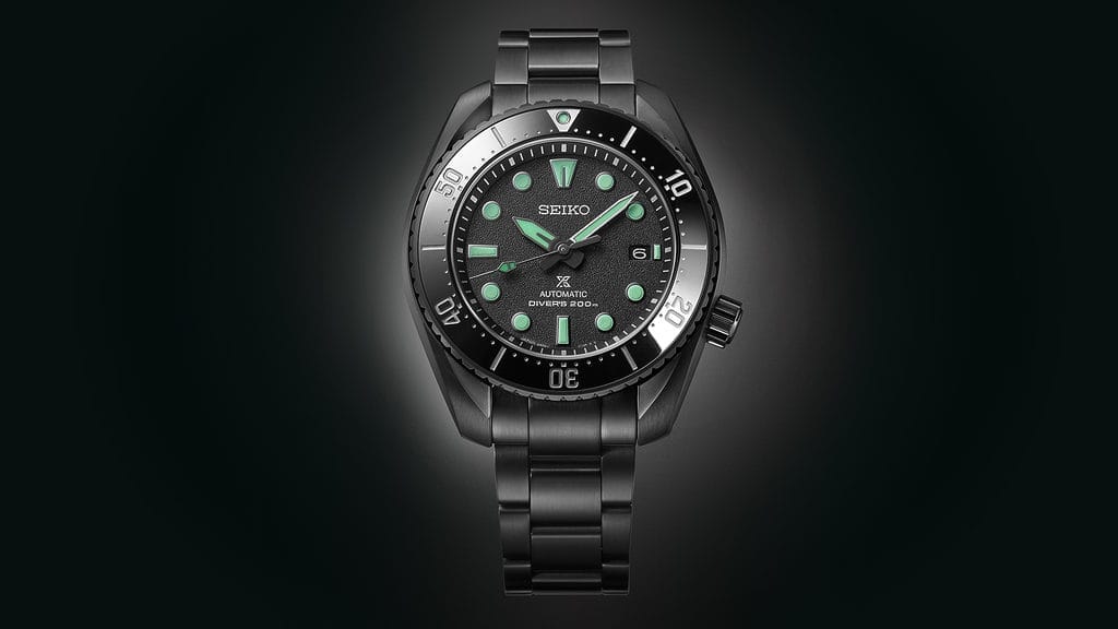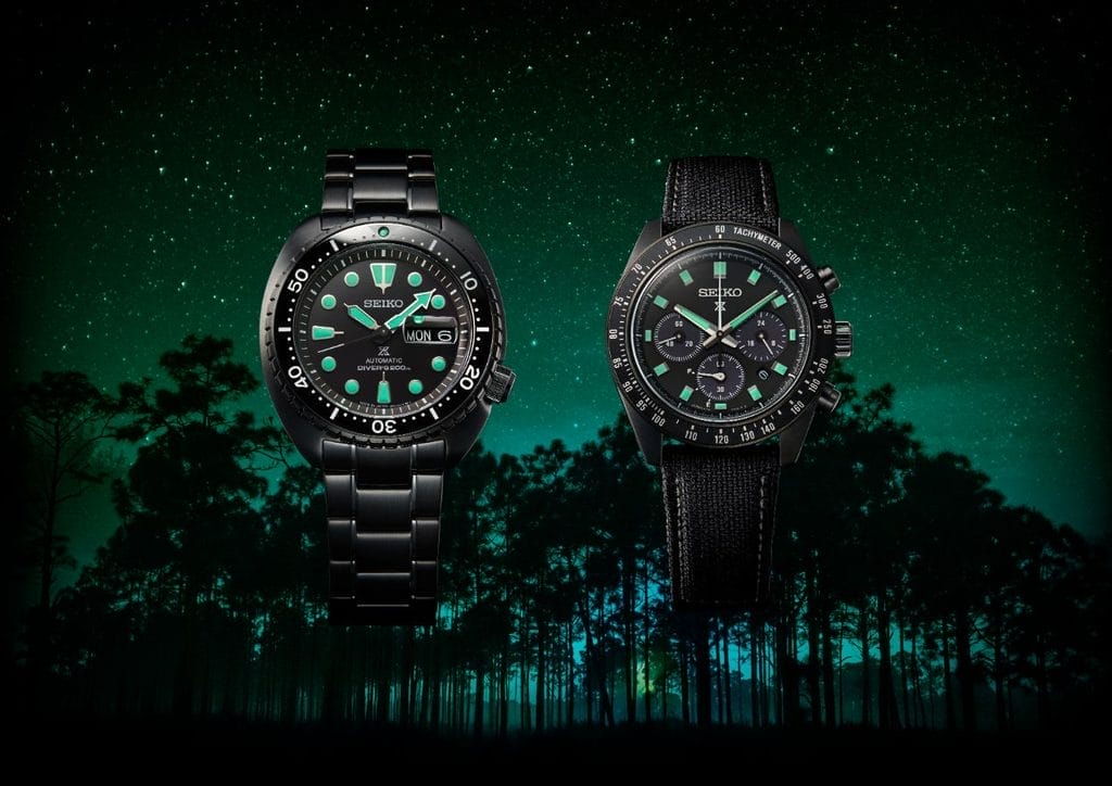 Seiko présente ses nouvelles créations Prospex Black Series, équipées de Green Lumibrite Pro© sur les aiguilles des heures et des minutes ainsi que sur les index.
