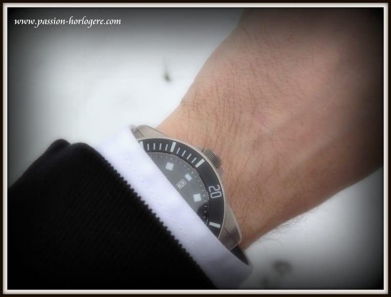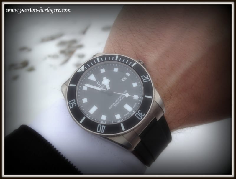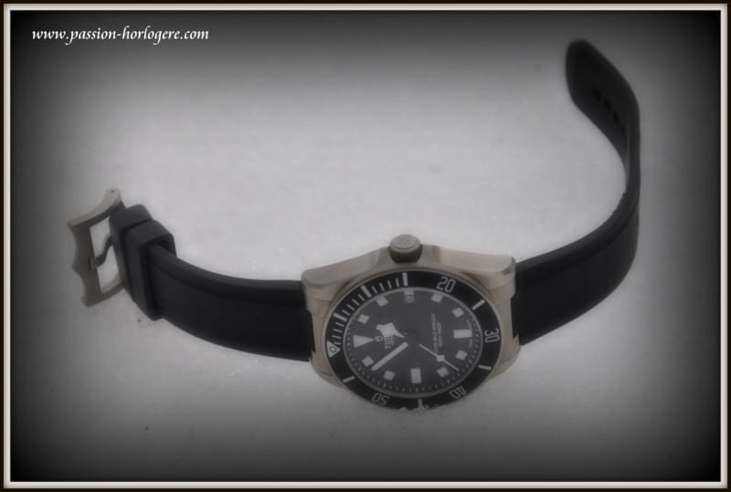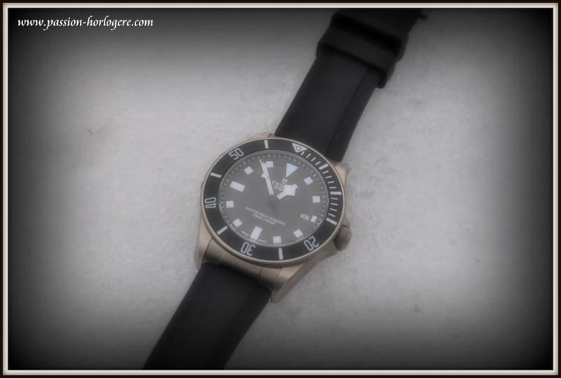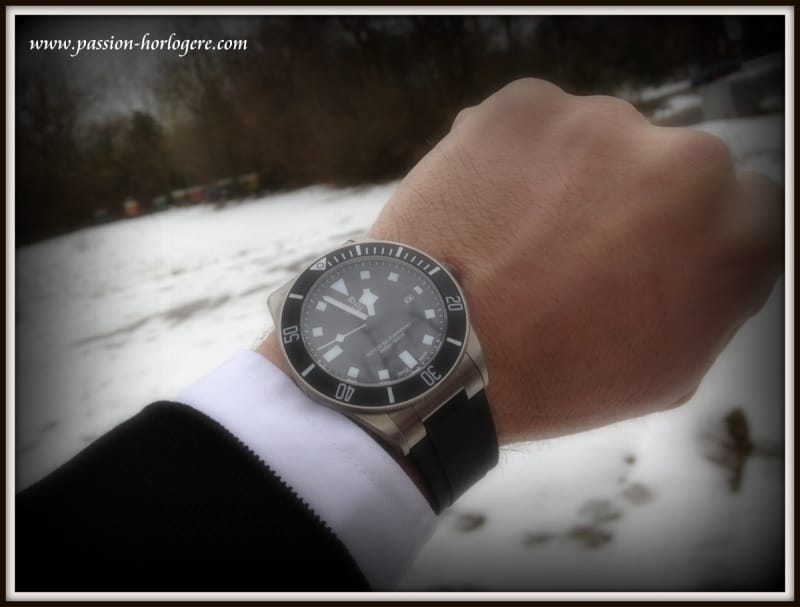 Ma première impression visuelle fut très positive. La montre est belle. Le Titane lui confère une couleur « gris souris » visuellement très esthétique. Au toucher, elle est aussi très agréable et aucun angle saillant ne vient altérer l’impression de qualité qu’elle dégage. La Pelagos est légère. Avec son bracelet de plongée en caoutchouc, l’ajustement au poignet est très aisé et confortable. Cela lui donne un aspect de montre très contemporaine, voire tendance (Cf. Hublot ou Rolex sur Rubber B), et « tool watch » à la fois.