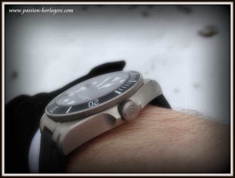 La boîte de 42 mm de diamètre est parfaitement proportionnée selon moi. A 3h, la couronne est protégée par deux épaulements anguleux rappelant la base d’un blason, logo de la marque. A l’opposé, à 9h la tranche est percée d’une valve à hélium conférant à la montre un look professionnel à souhait.