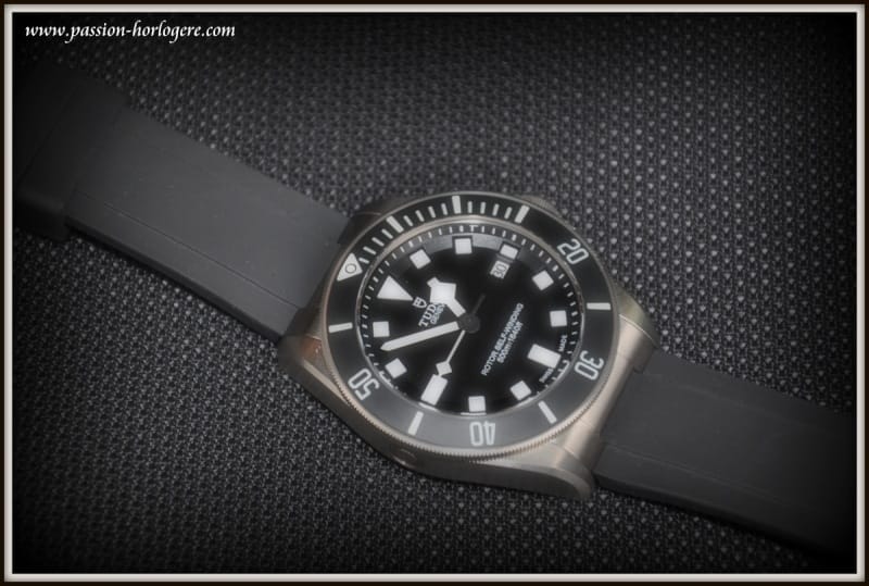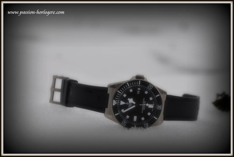 Ma première impression visuelle fut très positive. La montre est belle. Le Titane lui confère une couleur « gris souris » visuellement très esthétique. Au toucher, elle est aussi très agréable et aucun angle saillant ne vient altérer l’impression de qualité qu’elle dégage. La Pelagos est légère. Avec son bracelet de plongée en caoutchouc, l’ajustement au poignet est très aisé et confortable. Cela lui donne un aspect de montre très contemporaine, voire tendance (Cf. Hublot ou Rolex sur Rubber B), et « tool watch » à la fois.