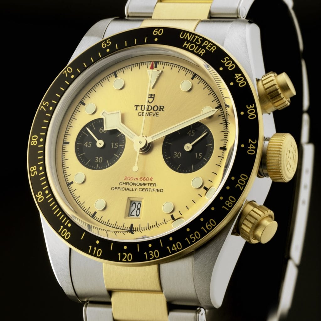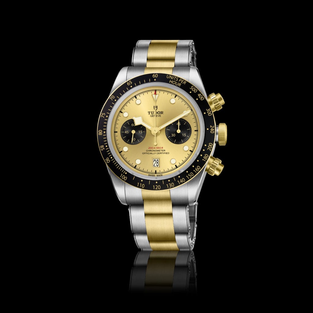 Fidèle dans son esprit à l’esthétique Black Bay, le modèle Black Bay Chrono S&G fait siennes les fameuses aiguilles « Snowflake », signature des montres de plongée de la marque depuis 1969, dans une version affinée pour une lecture optimale des informations de son cadran bombé. Proposé en deux versions, noir mat ou couleur champagne satiné soleil, le cadran compte deux compteurs creusés de couleurs contrastantes, respectivement couleur champagne et noir mat, pour une lisibilité optimale. Leur finition est cerclée. Dans le respect de la tradition des premières générations de chronographes TUDOR, le compteur des minutes est gradué à 45 et un guichet de date est placé à 6 h. Les lignes générales caractéristiques de Black Bay sont conservées dans un boîtier en acier et or jaune de 41 millimètres de diamètre. Typique de l’attention au moindre détail qui caractérise la marque, le dessin des poussoirs en or jaune est inspiré par la toute première génération de chronographes TUDOR. Une lunette fixe en or jaune avec un insert en aluminium éloxé noir et échelle tachymétrique complète l’apparence racée de ce chronographe sportif.