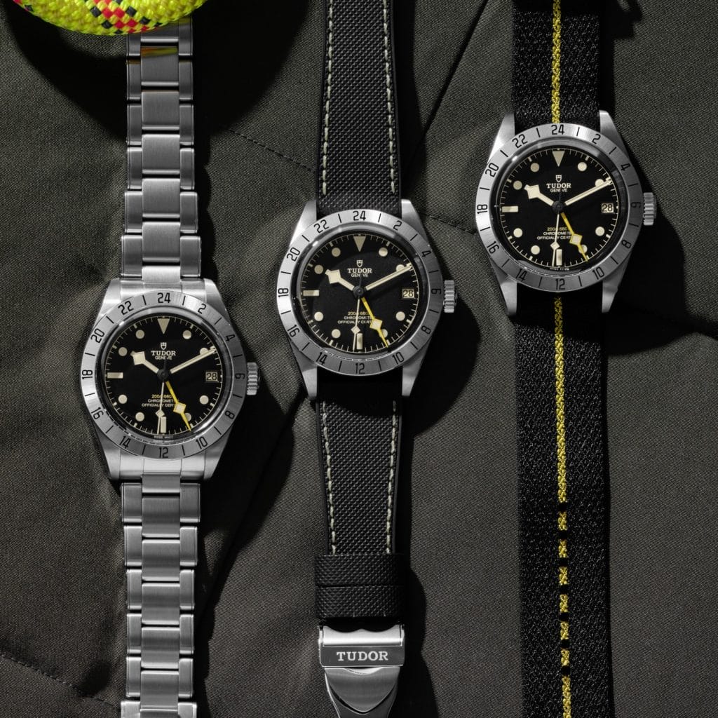 Pour Black Bay Pro, c’est un bracelet noir avec bande jaune qui a été choisi par TUDOR et tissé par cet artisan. Le modèle est également disponible sur bracelet en acier inspiré des bracelets pliés à rivets des montres TUDOR fabriquées dans les années 1950 et 1960. Leurs particularités étaient d’avoir les têtes de rivets de fixation des maillons apparentes sur la tranche du bracelet ainsi qu’une « fuite en escalier ». Ces deux détails esthétiques se retrouvent dans le bracelet actuel qui bénéficie toutefois d’une construction moderne avec maillons massifs et têtes d’axes finies au laser, façon rivet.