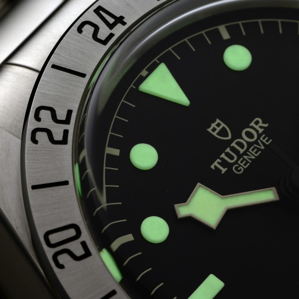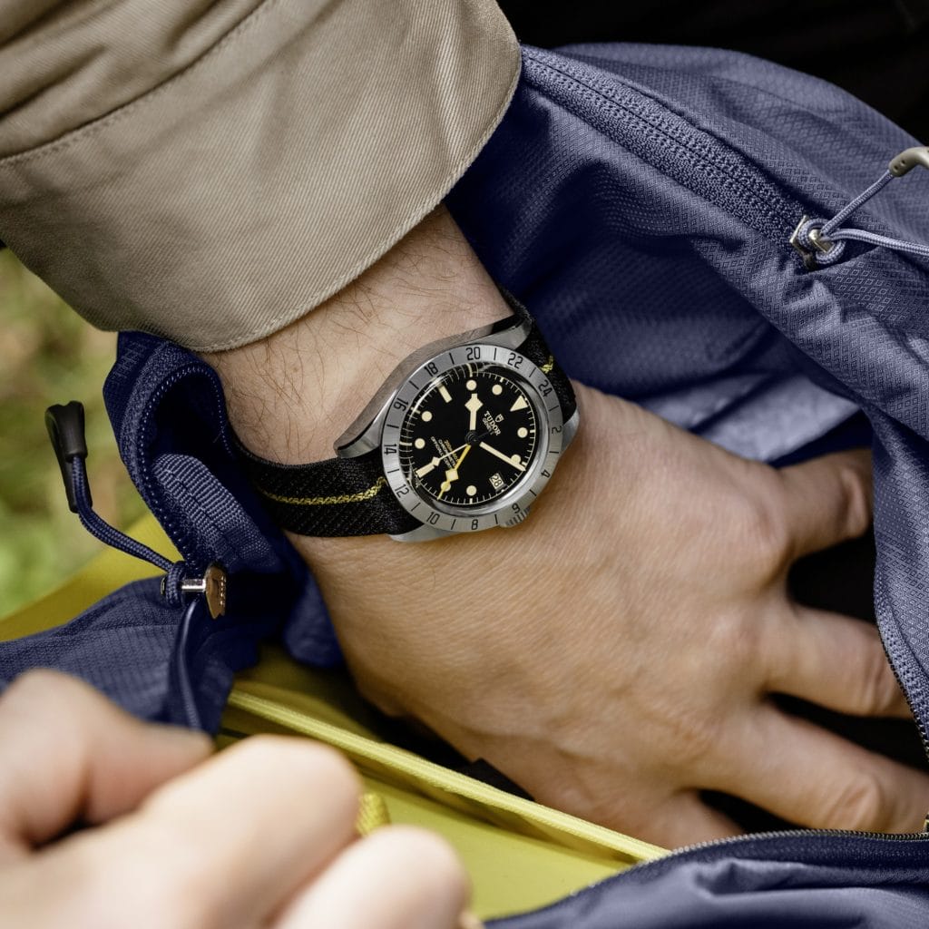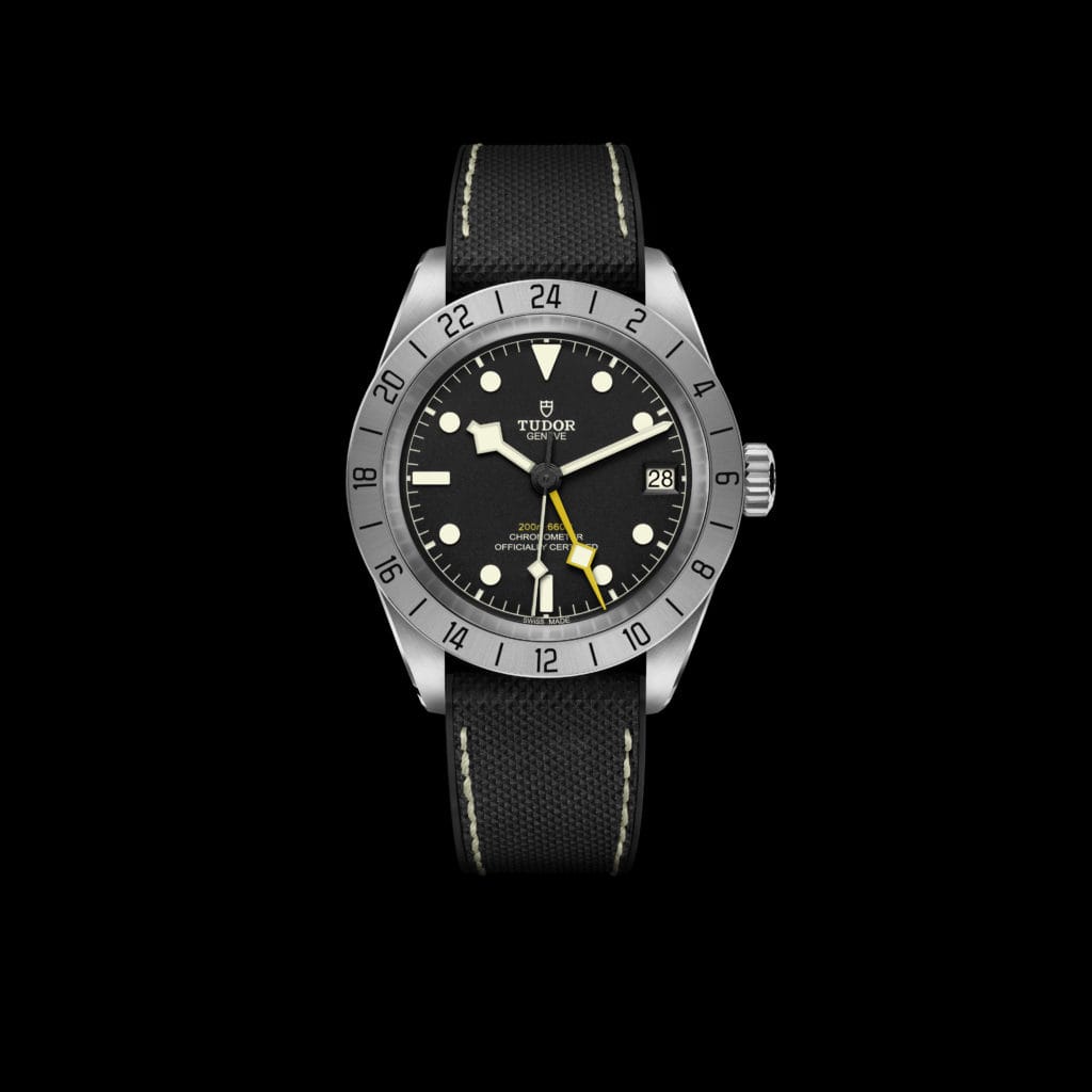 Sur le modèle Black Bay Pro, l’indication de l’heure de référence se fait grâce à une aiguille jaune à la forme angulaire dite « Snowflake », une signature esthétique emblématique de TUDOR, qui fait le tour du cadran en 24 heures. L’heure locale est indiquée par une autre aiguille « Snowflake » plus courte et qui se règle par saut d’heure, en arrière ou en avant. La date, affichée dans le guichet situé à 3 heures, est couplée à l’aiguille de l’heure locale de sorte qu’au passage rétrograde de minuit lors d’un réglage, elle saute instantanément au jour précédent. Une fonctionnalité rare, sophistiquée et surtout très confortable pour l’utilisateur.