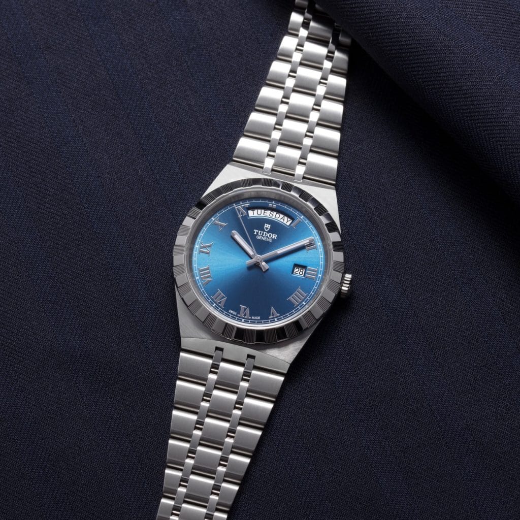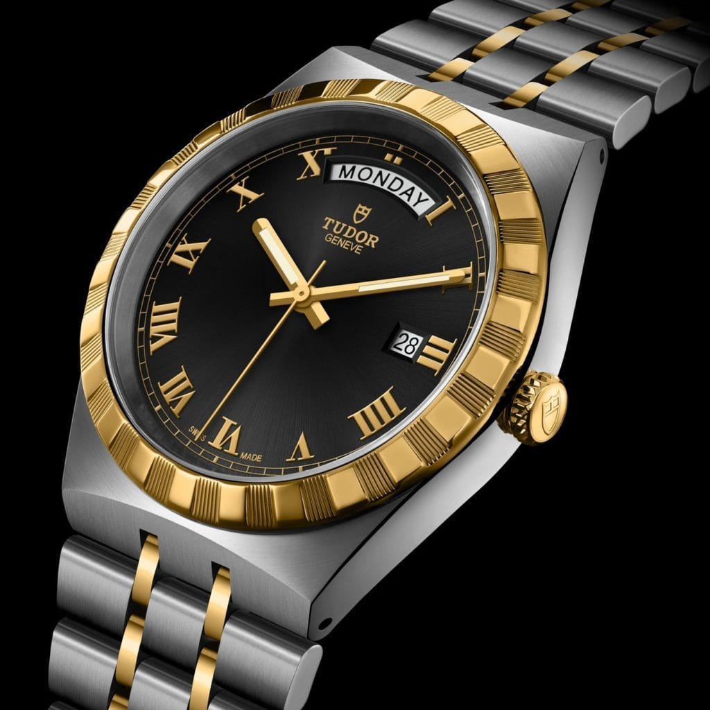 La ligne TUDOR Royal est un modèle d’équilibre, d’élégance et de polyvalence. Ses détails de design lui confèrent une personnalité unique, notamment sa lunette crénelée caractéristique, alternant les surfaces polie et rainurées. Avec son bracelet métallique intégré qui assure une ligne ininterrompue avec le boitier, TUDOR Royal mise sur la fluidité et un style assuré. Caractérisé par ses trois larges maillons satinés entrecoupés de deux éléments plus fins polis, la douceur de ses surfaces et surtout de ses arêtes signale l’attention que TUDOR porte au confort de porter. Disponible en acier ou dans une alternance d’éléments en acier et en or jaune, les modèles de cette ligne s’adaptent à tous les goûts grâce à des finitions soignées. Disponible dans quatre diamètres, TUDOR Royal trouvera sa place sur les poignets de toutes tailles. La version 41 mm bénéficie d’un traitement particulier puisque son mouvement mécanique lui permet un affichage à la fois du jour et de la date.