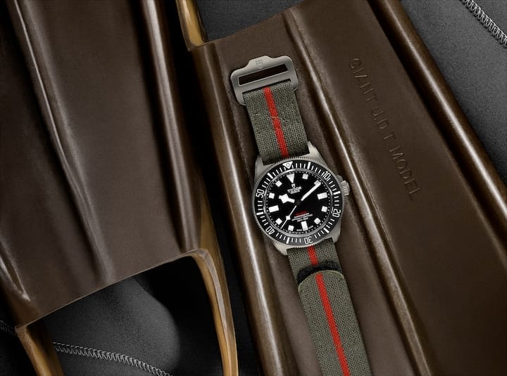 Historiquement, les plongeurs de l’US Navy portaient leurs montres TUDOR avec des bracelets en tissu, généralement d’une seule pièce, en nylon noir ou vert. Les deux bracelets de la Pelagos FXD sont un clin d’œil à cette habitude militaire d’assortir les montres de bracelets en tissu, plutôt que de bracelets traditionnels, mais avec une légère variation. Dans sa configuration principale, la montre est présentée avec un bracelet en tissu vert d’une seule pièce avec bande rouge et scratch. Elle est également accompagnée d’un bracelet en caoutchouc d’une seule pièce supplémentaire, avec motif tissu noir, qui apporte une subtile touche de fraîcheur à un style classique.