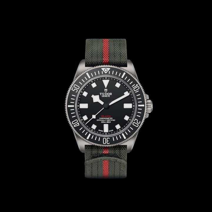 Le bracelet en tissu d’une seule pièce est l’une des signatures de TUDOR qui est devenue, en 2010, l’une des toutes premières marques horlogères à le proposer avec ses montres. Tissé de manière artisanale sur des métiers Jacquard à navette du XIXe siècle par l’entreprise Julien Faure dans la région de Saint‑Étienne, en France, sa qualité, sa robustesse et son confort au porter sont uniques. Pour le modèle Pelagos FXD, une construction très technique de bracelet a été développée par TUDOR et Julien Faure. Composé d’un ruban vert forêt en nylon tissé de 22 mm avec bande centrale rouge, d’une boucle « D » en titane et d’une fermeture à scratch, il s’adapte à différentes tailles de poignet tout en offrant un grand confort d’utilisation.