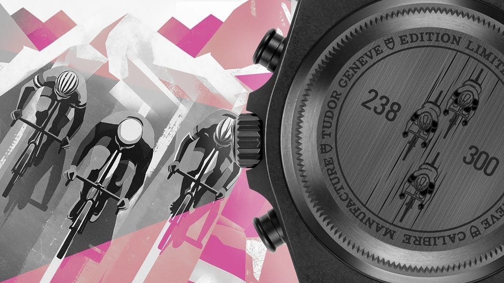 Le cadran noir mat, ponctué de touches de rose en hommage aux couleurs du Giro, est conçu pour une lisibilité optimale. Les index carrés, emblèmes esthétiques de TUDOR depuis les années 1960, sont réalisés en céramique luminescente pour une visibilité maximale en course. Les aiguilles, de type Snowflake, participent à cette recherche de clarté et d’efficacité. L’échelle tachymétrique personnalisée est intégrée sur un rehaut incliné à 45 degrés autour du cadran.