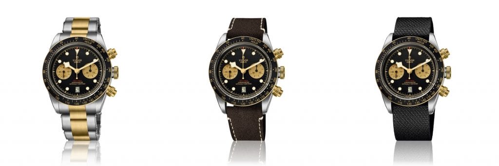 Le bracelet en tissu est l’une des signatures de TUDOR qui fut l’une des premières marques horlogères à le proposer. Tissé de manière artisanale sur des métiers Jacquard du 19ème siècle par une entreprise familiale centcinquantenaire de la région de St-Etienne, sa qualité de facture et son confort au porté sont uniques. Pour la Black Bay Chrono, c’est un bracelet noir qui a été choisi par TUDOR et tissé par cet artisan. Le modèle est également disponible monté sur bracelet en acier et or jaune inspiré des bracelets pliés à rivets des montres TUDOR fabriquées dans les années 50 et 60. Leurs particularités étaient d’avoir les têtes de rivets de fixation des maillons apparentes sur la tranche du bracelet ainsi qu’une « fuite en escalier ». Ces deux détails esthétiques se retrouvent dans le modèle d’aujourd’hui qui bénéficie toutefois d’une construction moderne avec maillons massifs. Enfin, dans un esprit on ne peut plus 70’s racing, La Black Bay Chrono offre une option de type «manchette» en cuir vieilli marron avec surpiqures écrues et boucle déployante.