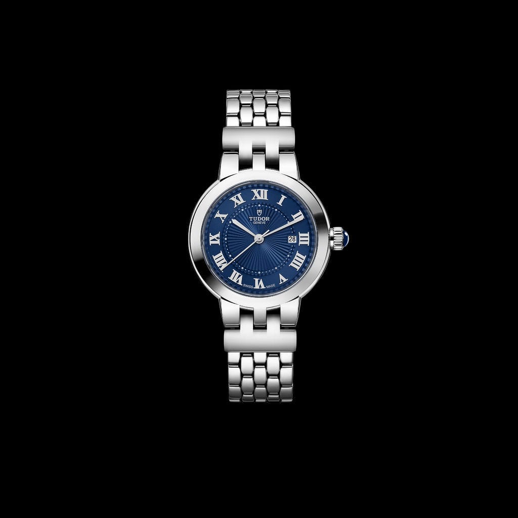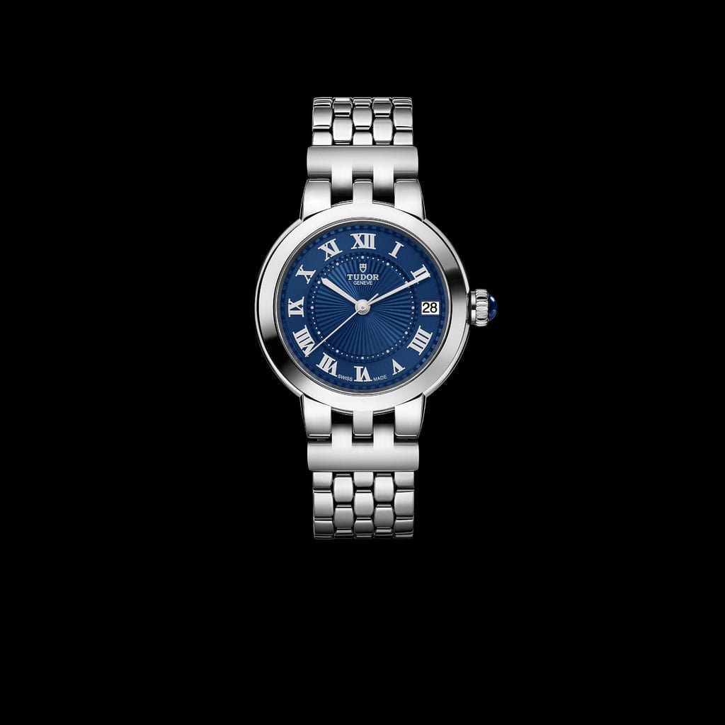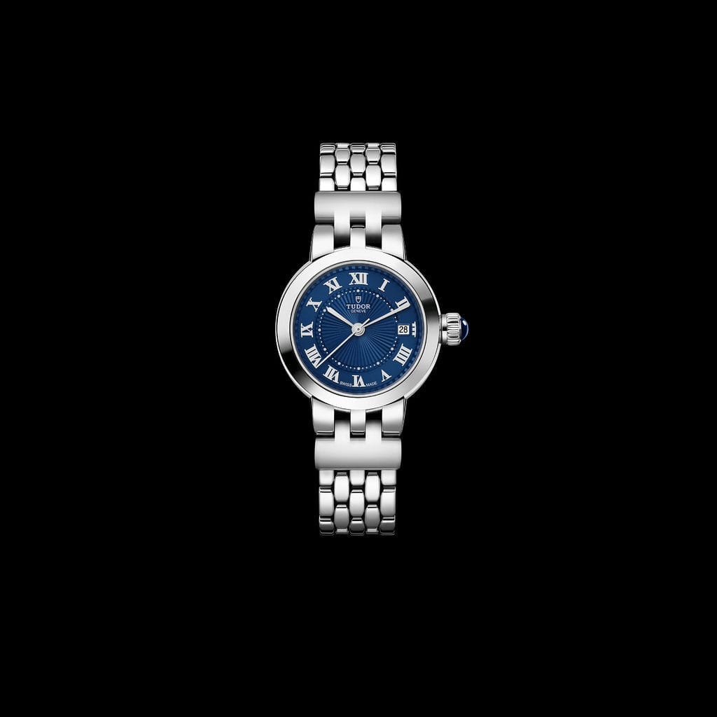 Clair de Rose est une ligne classique de TUDOR dont le nom fait poétiquement référence à la fois au clair de lune et au logo historique de la marque, une rose, combinant les deux de manière ludique. En 2024, la gamme s’agrandit avec un tout nouveau cadran « bleu TUDOR ». Dans un esprit classique, épuré et intemporel, ce nouveau modèle fait usage des codes esthétiques historiques de la marque sans se départir des douces courbes de sa carrure et de sa couronne caractéristique, ici sertie d’un cabochon spinelle bleu. Disponible en trois tailles, 26, 30 et 34 millimètres de diamètre, la gamme est déclinée avec des cadrans opalins et désormais « bleu TUDOR » aux délicats décors en relief, ponctués de chiffres romains ou de diamants. La Clair de Rose est équipée d’un mouvement automatique avec fonction date et est exclusivement proposée en acier.