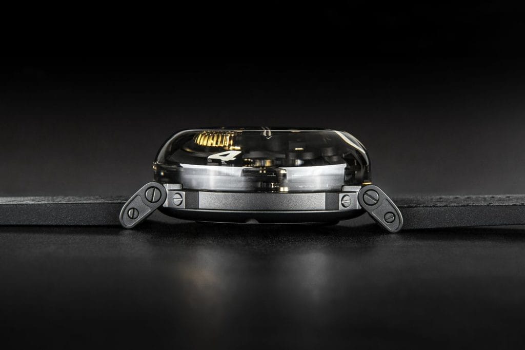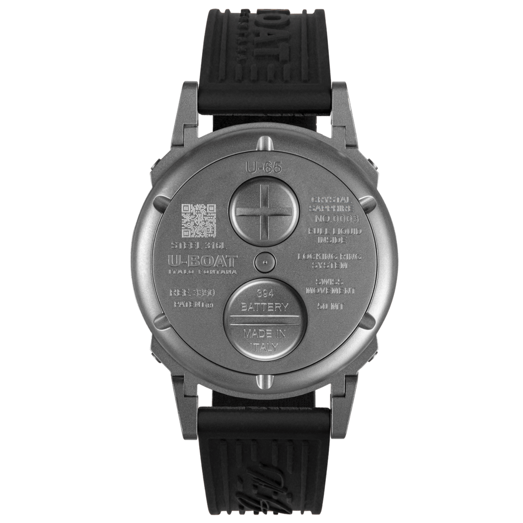 En cohérence avec les codes de la marque, la U-65 abandonne la traditionnelle couronne latérale gauche au profit d’un bouton central discret, placé au dos du boîtier. Le réglage se fait par ce biais, sécurisé par un système de verrouillage innovant, le Locking Ring System, qui permet un ajustement précis heure par heure. Une trappe vissée permet un changement de pile rapide, tandis qu’une autre donne accès au remplissage du liquide.