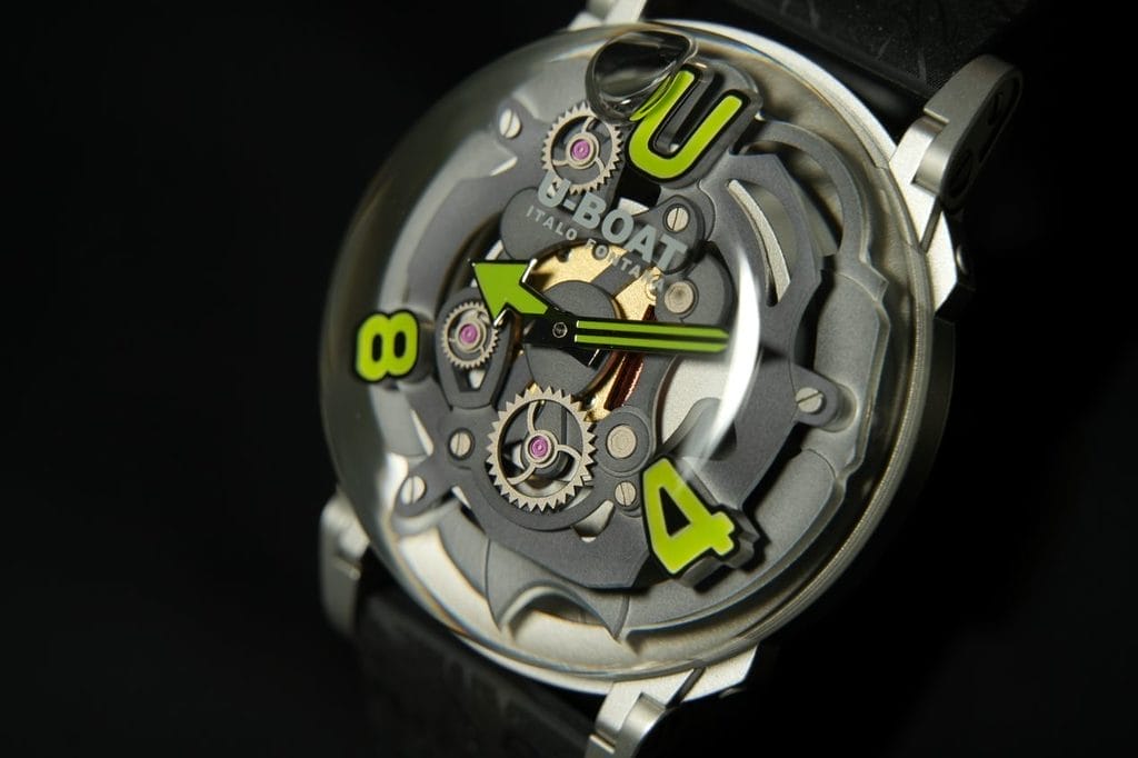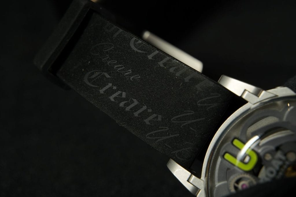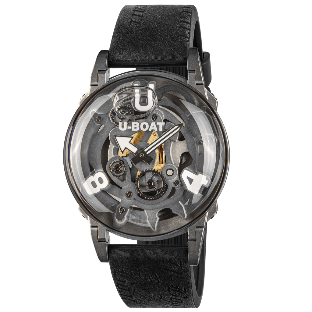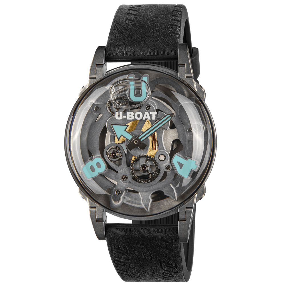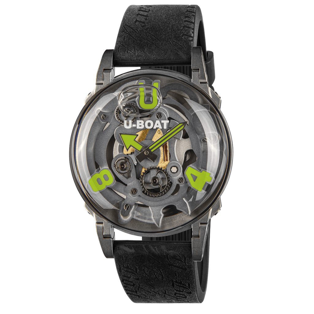 Le cadran squelette, structuré sur trois niveaux et proposé en nuances de gris ou de noir, affirme une inspiration industrielle. Il est sublimé par la technologie Oil Immersion développée par U-BOAT, déjà éprouvée sur les collections Capsoil et Darkmoon. Un liquide spécial entoure le mouvement Ronda 756, créant une impression saisissante de profondeur et amplifiant l’effet bombé du verre, pour une lecture en relief saisissante. Une petite bulle mobile flotte librement sur le cadran, interagissant avec les repères situés à 12, 8 et 4 heures, ainsi qu’avec les aiguilles en forme de flèche. Ces éléments sont traités avec un revêtement lumineux décliné en vert acide, aigue-marine et blanc, assurant une visibilité parfaite.