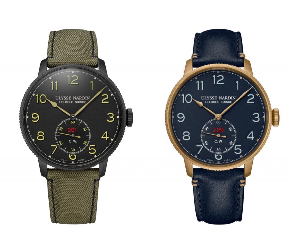 Étanches jusqu’à 50 mètres et estampillées de l’emblématique Torpilleur sur le fond, les deux éditions sont habillées d’une majestueuse couronne et d’un boîtier 44 mm. Muni du mouvement Manufacture UN-118, équipé d’un échappement à ancre en silicium, le modèle est certifié COSC. La petite seconde, située à 6 heures, est agrémentée du numéro individuel teinté de rouge. Le modèle, gravé des initiales C.W. (« Chronometer Watch »), affiche fièrement sa référence aux chronomètres militaires du passé, dont le design respectait rigoureusement les codes des forces armées.