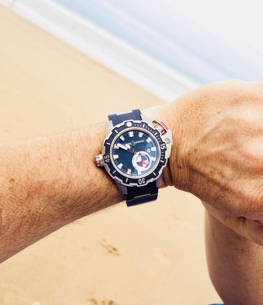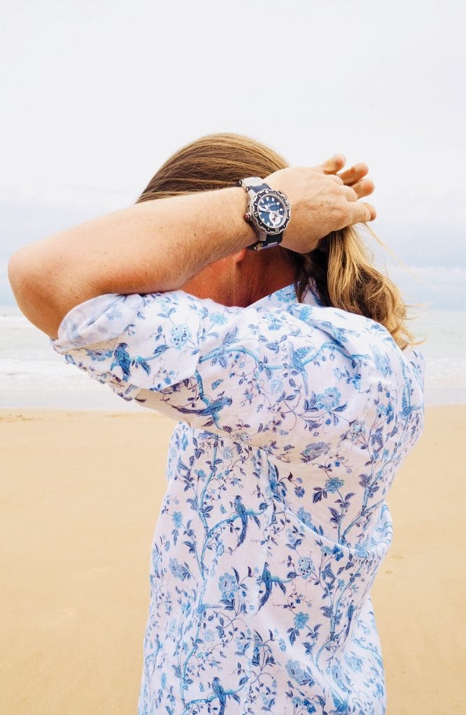 Pour accompagner Alex sur la surface de l’eau, la Diver Deep Dive d’Ulysse Nardin. Une montre de sport robuste et fonctionnelle, étanche jusqu’à 1 000 mètres. Entraînée par le calibre Manufacture UN-320, les fonctionnalités de la Diver Deep Dive ont été pensées pour les sports extrêmes sous et sur la mer : une valve à hélium, un protège-couronne en titane amovible, un bracelet en caoutchouc extensible et ajustable, et une grande lunette dotée de 12 crans pour une manipulation aisée. Quinze requins ornent son cadran, en plus de celui qui est frappé sur le fond de la boîte, pour nous rappeler que l’homme n’est qu’un visiteur des océans et que la mer appartient aux animaux.