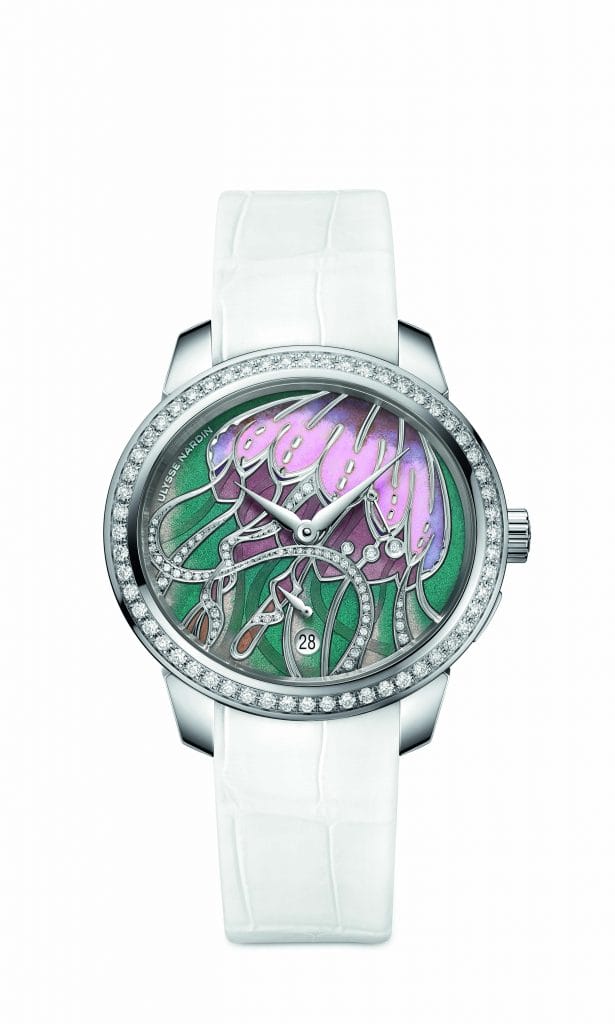 L’élégance ensorcelante de la montre Jade « Jellyfish » atteint des sommets de beauté avec l’utilisation d’une technique d’émaillage rare maîtrisée par les spécialistes de Donzé Cadrans, membre du groupe Ulysse Nardin. D’inspiration marine, son cadran est en émail champlevé.