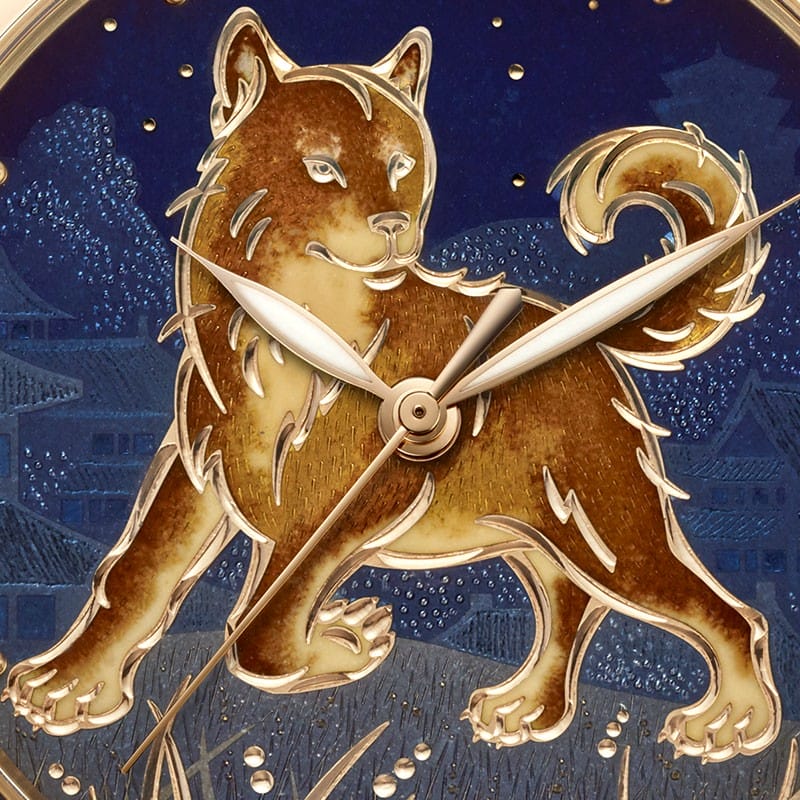Dans cette représentation plus vraie que nature, l’artiste a mis en scène cet être affectueux et joyeux dans un décor de pleine nature. Des techniques d’émaillage séculaires ont ensuite été employées pour accroître le raffinement du dessin. La méthode Grand Feu – dont le nom reflète l’incroyable température nécessaire à la fusion de l’émail – a ainsi été associée au champlevé : des cavités ont été gravées directement sur le cadran à l’aide d’un burin avant d’être remplies d’émaux de différentes couleurs. La dernière opération, la plus délicate, a consisté à enrichir le motif en ciselant toutes les parties métalliques en surface.