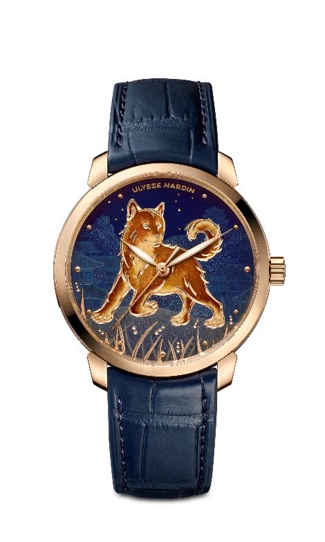 La collection Classico compte diverses montres en émail que bon nombre d’amateurs convoitent et aiment à collectionner. À l’occasion de la nouvelle année chinoise, commençant en février 2018, Ulysse Nardin présente la Classico Dog, une édition limitée de 88 pièces en or rose 18 carats munie d’un mouvement UN-815 à remontage automatique. Doté d’une réserve de marche de 42 heures et bénéficiant de la certification COSC, ce garde-temps au cadran en émail Grand Feu champlevé, étanche jusqu’à 50 m, est habillé d’un boîtier de 40 mm et maintenu en place par un bracelet en alligator.