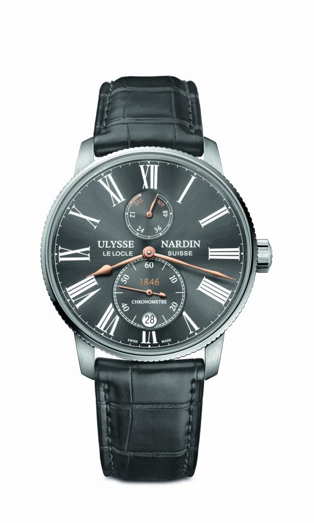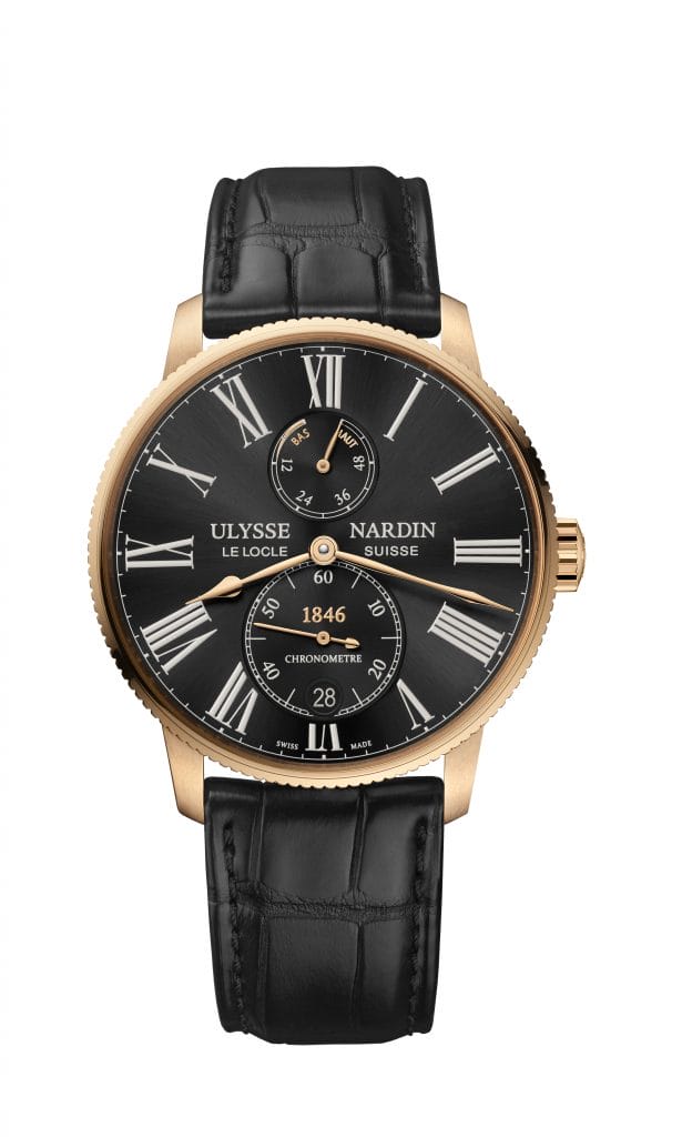Proposée à l’origine avec un cadran blanc ou bleu, la flotte Marine Torpilleur se voit aujourd’hui adjoindre deux superbes nouvelles éditions : une version or rose avec cadran noir et doré, et une version boutique exclusive en acier inoxydable avec cadran gris. D’élégants chiffres romains allongés et de gracieuses aiguilles poire couleur or rose, assorties aux indications « Haut » et « Bas » de la réserve de marche, marquent les heures. La couronne vissée porte gravé le logo Ulysse Nardin. À 6 heures, au centre du compteur de la petite seconde, se trouvent le guichet de la date et le logo « 1846 » rouge, clin d’œil à l’année de naissance de la Maison. L’ensemble repose sur un luxueux bracelet en alligator assorti.
