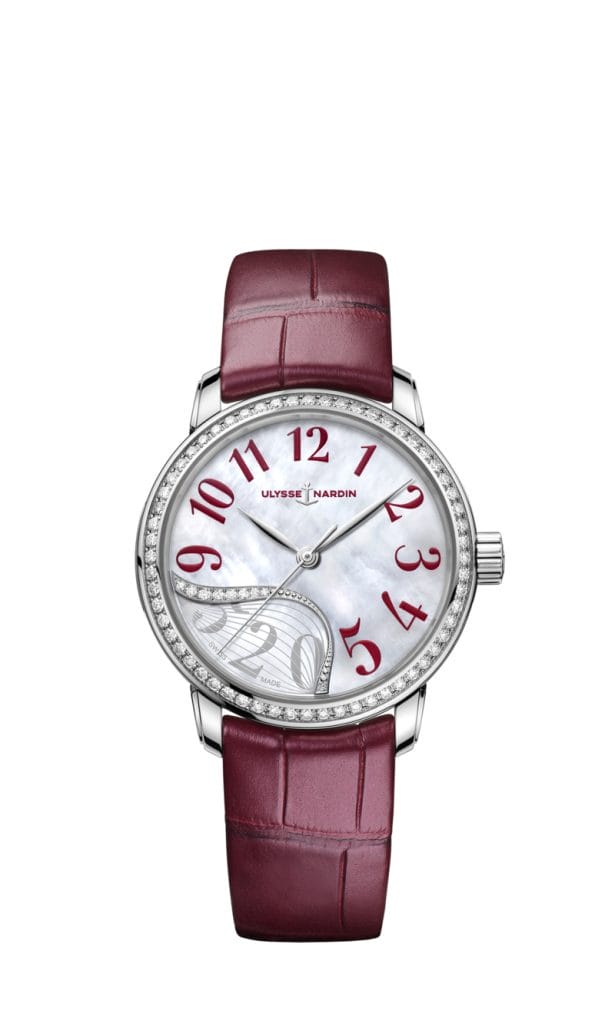 Des couleurs très féminines rehaussent les nuances du nacre et le feu incandescent des diamants : bleu sur le bracelet en cuir et les grands chiffres arabes, rouge bordeaux sur bracelet et les index, ou encore gris foncé sur le bracelet et gris sur le cadran pour la version or rose. La version bordeaux est également proposée avec une lunette plus discrète, non sertie, en acier inoxydable.