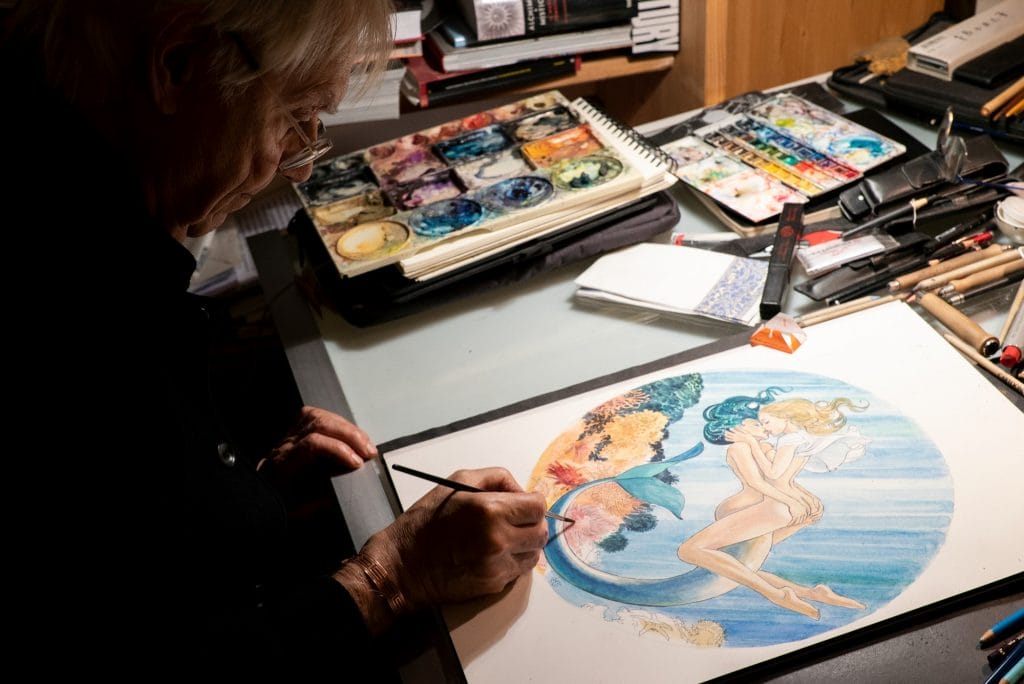 « J’ai dû réfléchir à un thème qui réunit ces dix images mais préserve leur indépendance afin qu’elles se suffisent à elles-mêmes », explique Manara dans son studio de Valpolicella, en Italie. « Cette histoire n’est pas linéaire mais possède un fil conducteur autour de deux personnages : une femme éternelle et une sirène. »