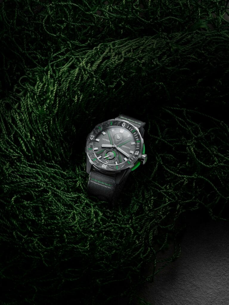 Les brancards latéraux du boîtier de 44mm et le cerclage du fond de la DIVER THE OCEAN RACE sont le résultat d’un mix de matériaux intéressant : 40% de Carbonium ® (Lavoisier Composites) et 60% de polyamide recyclé à partir de filets de pêche, Nylo® (FIL&FAB). Ulysse Nardin a fait confiance à trois jeunes designers bretons qui ont créé la première filière de recyclage de filets de pêche en France. FIL&FAB, startup issue du design industriel et de la transition, récupère auprès des ports français les filets hors d’usage et les recycle en granulés de polyamide appelés Nylo®.