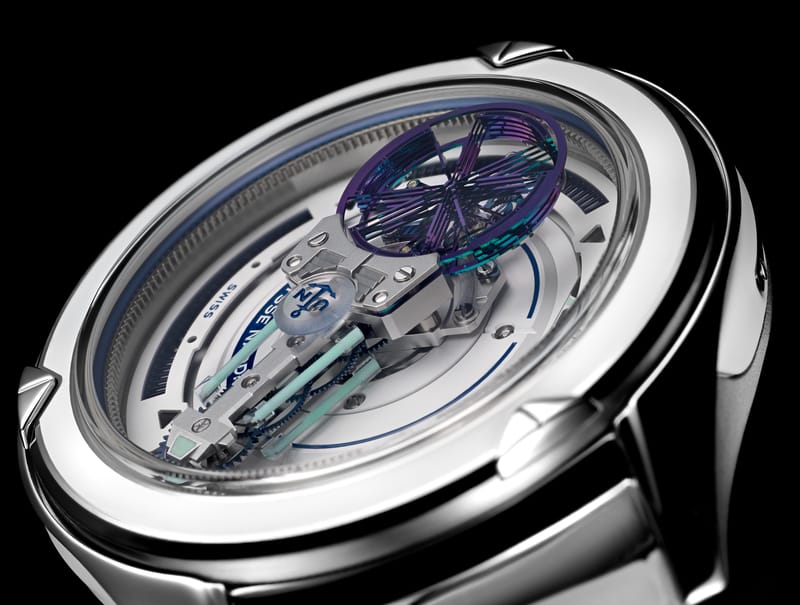 L’oscillateur volant neXt, avec sa construction en 3D multicouches – quatre couches de lames et une couche massive qui sert de volant d’inertie – est une avancée technique majeure pour la recherche horlogère. Ce nouvel oscillateur permet de se passer de pivots et de pierres. La nouvelle FREAK s’offre un cœur qui bat « suspendu », en « lévitation », sans coq, c’est-à-dire sans pont de balancier. La résultante directe d’un tel système n’est autre que la suppression totale des frottements de paliers, optimisant le facteur qualité global et donc la consommation énergétique du mouvement. La friction restante se résume à celle avec l’air. Plus ou peu de friction, plus de contacts, plus d’usure, plus d’huile.