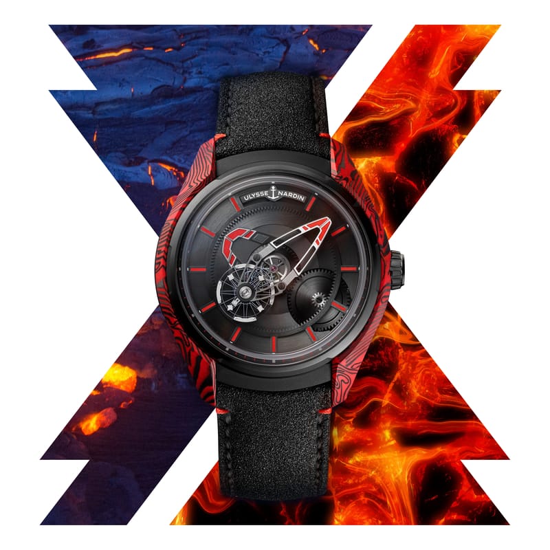 Bouillonnant mélange de fibre de carbone et de résine époxy marbrée de rouge, chaque FREAK X MAGMA est unique. Conservant ses éléments essentiels, cette montre est légère, résistante aux rayures et uniformisée. Volcanique, virile et pleine de vigueur, l’association de rouge et de noir hypnotise et électrise. Masculine, angulaire et revêtue de rouge lave, la FREAK X MAGMA d’Ulysse Nardin est une force de la nature, une montre de style, d’action et d’élégance. Avec son bracelet en cuir noir à points de bride rouges équipé d’une boucle déployante, elle évoque la roche volcanique obsidienne et les coulées de lave qui l’ont inspirée, tandis que les effets de sablage et de polissage sur la lunette, combinés à la surface parfaitement lisse du cadran, reflètent les contrastes des paysages volcaniques. Le Superluminova appliqué sur les éléments rouges du cadran permet à celui qui la porte de lire l’heure dans l’obscurité la plus noire de la nuit. Le fond ouvert de ce modèle uniquement disponible en boutique dévoile le mouvement UN-230 à remontage automatique, chef-d’œuvre du légendaire savoir-faire horloger d’Ulysse Nardin.