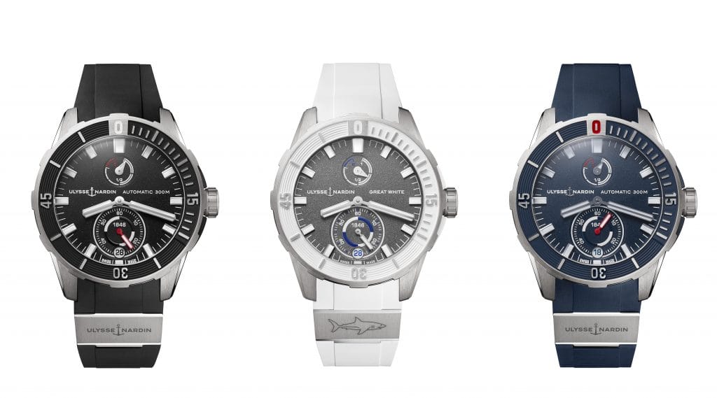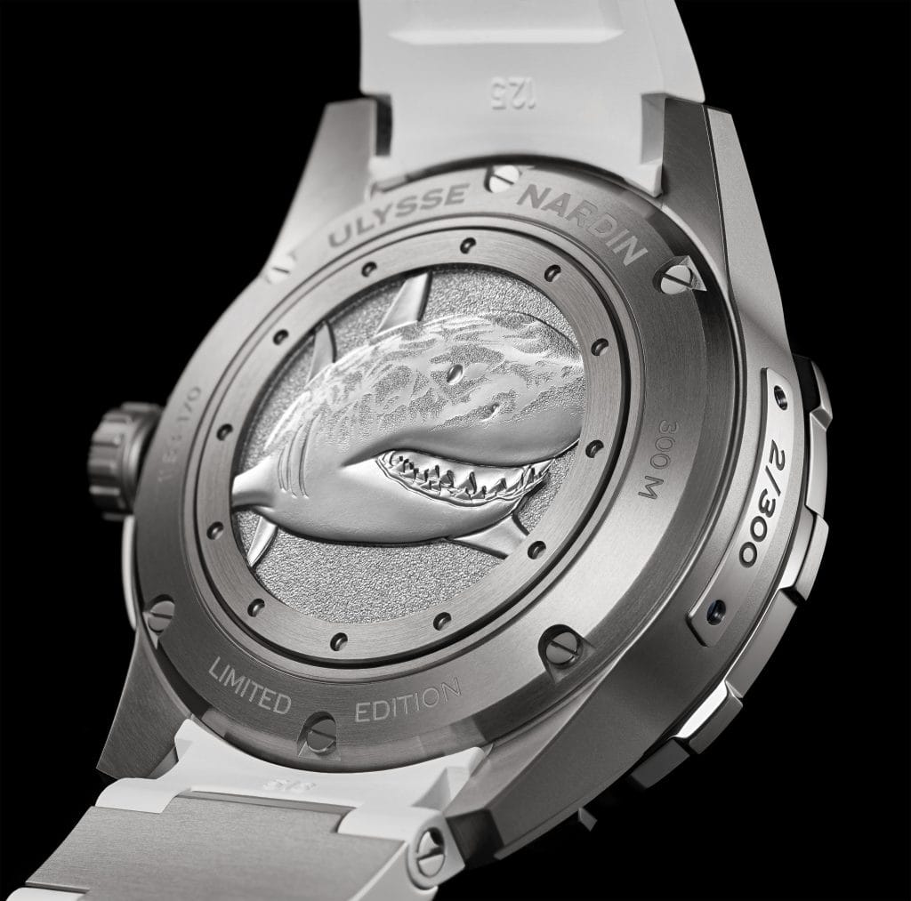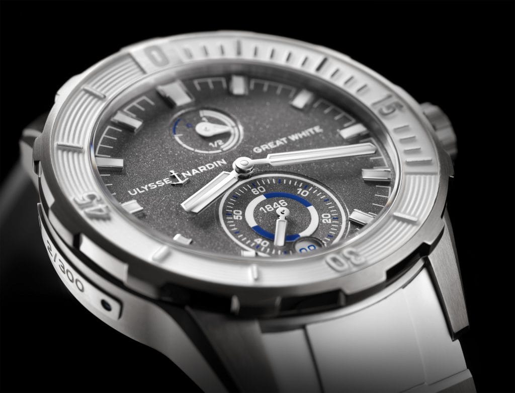 La Diver Chronometer Great White, avec son requin blanc estampillé sur le fond de la boîte, représente à merveille la philosophie d’Ulysse Nardin. Roi des océans, le requin symbolise la discrétion, la puissance et la stratégie. La Diver Chronometer Great White incarne ces qualités, tout comme Fred Buyle, Alex Caizergues, Sébastien Destremau et Mathieu Crepel, ces aventuriers du monde moderne, sur terre comme en mer, fiers ambassadeurs de la marque Locloise.