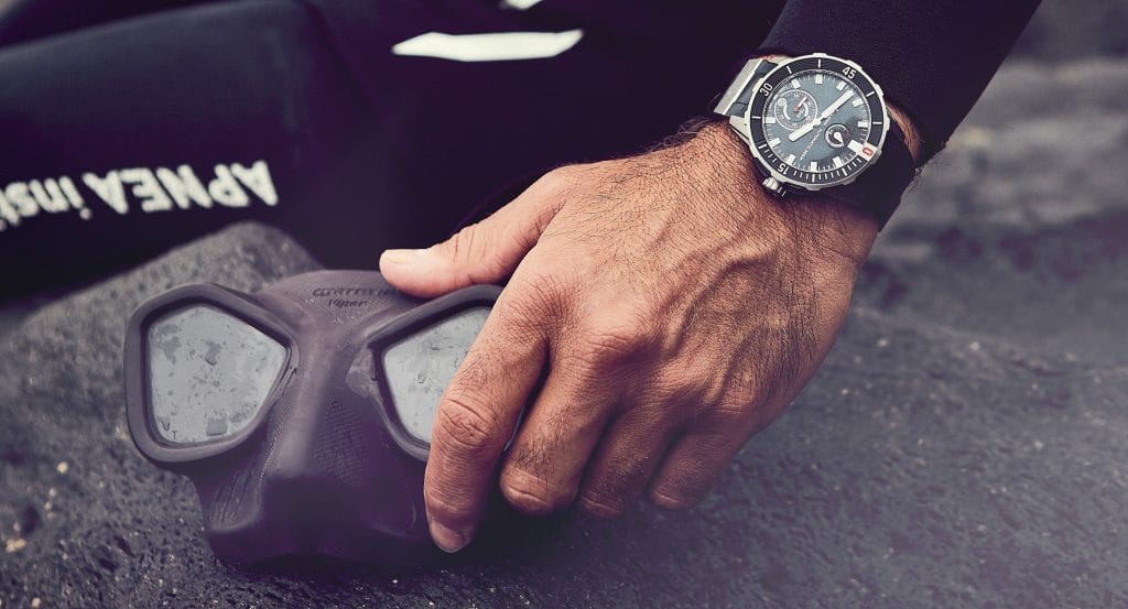 L’apnéiste et ambassadeur Ulysse Nardin Fred Buyle nous explique pourquoi la marque est un partenaire clé de ses aventures : « Le principal avantage de l’apnée, c’est que l’équipement nécessaire est minimaliste. J’emporte avec moi uniquement une combinaison, une montre de plongée, une paire de palmes, un masque et, bien sûr, mon équipement de photographie. La montre est l’élément le plus important. Les apnéistes développent une relation particulière avec le temps. Parfois, il passe vite ; parfois lentement, jusqu’à donner l’impression de s’arrêter complètement. Notre montre devient notre meilleur allié. Personnellement, je ne retire jamais ma Diver Ulysse Nardin. Je compte sur elle pour gérer ma perception du temps. Une montre automatique est essentielle pour avoir l’esprit tranquille : aucun risque que la pile nous lâche en pleine mer. »