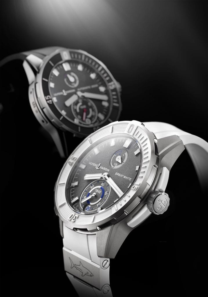 La Diver Chronometer Great White, avec son requin blanc estampillé sur le fond de la boîte, représente à merveille la philosophie d’Ulysse Nardin. Roi des océans, le requin symbolise la discrétion, la puissance et la stratégie. La Diver Chronometer Great White incarne ces qualités, tout comme Fred Buyle, Alex Caizergues, Sébastien Destremau et Mathieu Crepel, ces aventuriers du monde moderne, sur terre comme en mer, fiers ambassadeurs de la marque Locloise.