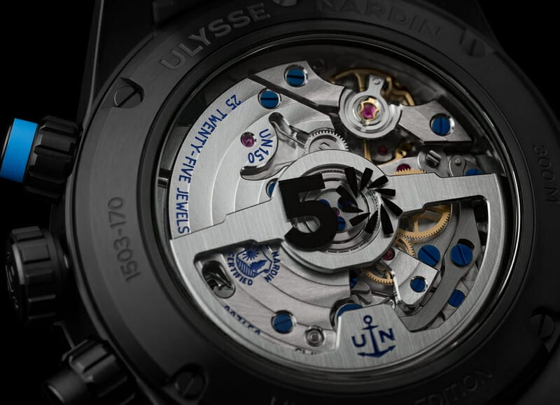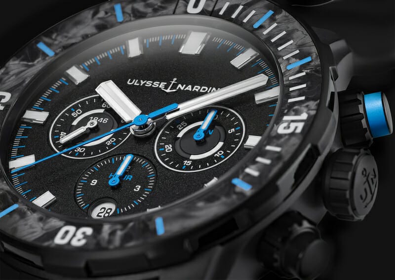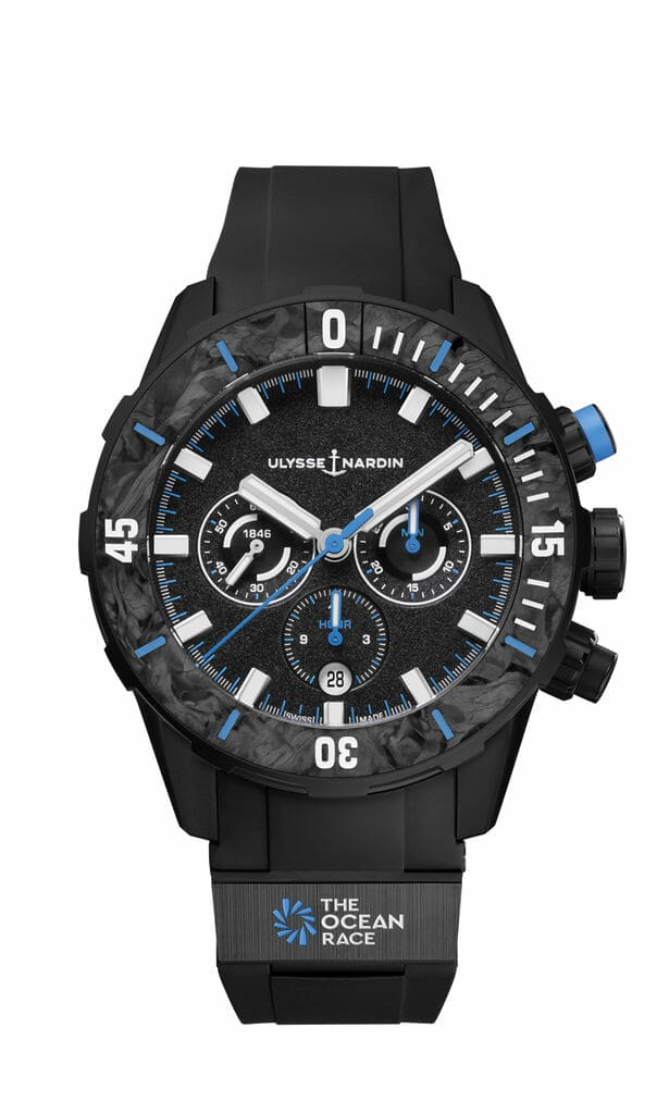 Étanche à 300 mètres, son boîtier en titane DLC noir sablé de 44 mm abrite le calibre Manufacture chronographe Ulysse Nardin UN-150 et ses 318 composants. Un mouvement visible à travers le fond saphir arborant le chiffre « 50 » qui rend hommage à cet anniversaire. Le logo de The Ocean Race est apposé sur l’élément en céramique agrémentant le bracelet caoutchouc et sa boucle ardillon. La lunette unidirectionnelle est habillée de Carbonium®, qui contient des fibres upcyclés de chutes de production de fuselage d’avion, offrant ainsi un impact environnemental 40% inférieur à celui des autres composites en carbone. Rappelons qu’en 2019 Ulysse Nardin fut la première Maison horlogère à utiliser ce matériau inédit dans une montre. Son rapport résistance-légèreté est incomparable et son superbe effet marbré fait de cette montre une pièce tout à fait singulière.