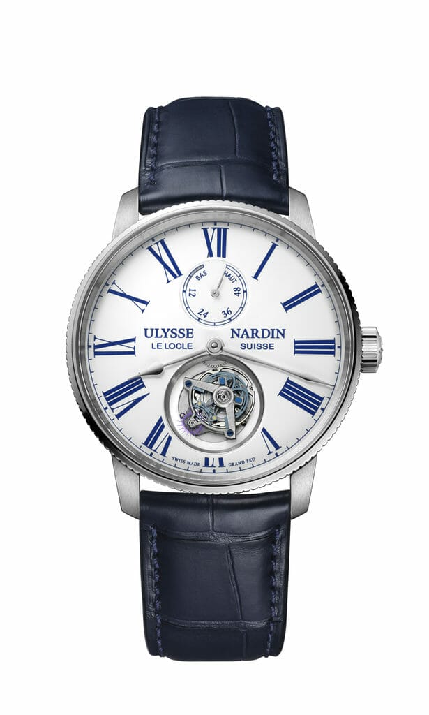 Alors que la marque a lancé l’année dernière la Marine Torpilleur Tourbillon en émail Grand Feu noir en série limitée de 175 pièces, elle dévoile aujourd’hui dans collection permanente la Marine Torpilleur Tourbillon en émail Grand Feu blanc. Doté d’un fond saphir ouvert, ce modèle en acier poli et satiné est complété par une lunette cannelée. Le cadran blanc en émail « Grand Feu », conçu par Donzé Cadrans, affiche fièrement sa réserve de marche à 12 heures. Le calibre manufacture UN-128 automatique anime le tourbillon volant à échappement constant équipé d’une ancre volante en silicium, dont le système a été breveté par Ulysse Nardin et a remporté le Prix du Tourbillon lors de la cérémonie annuelle du GPHG (Grand Prix d’Horlogerie de Genève) en 2015.