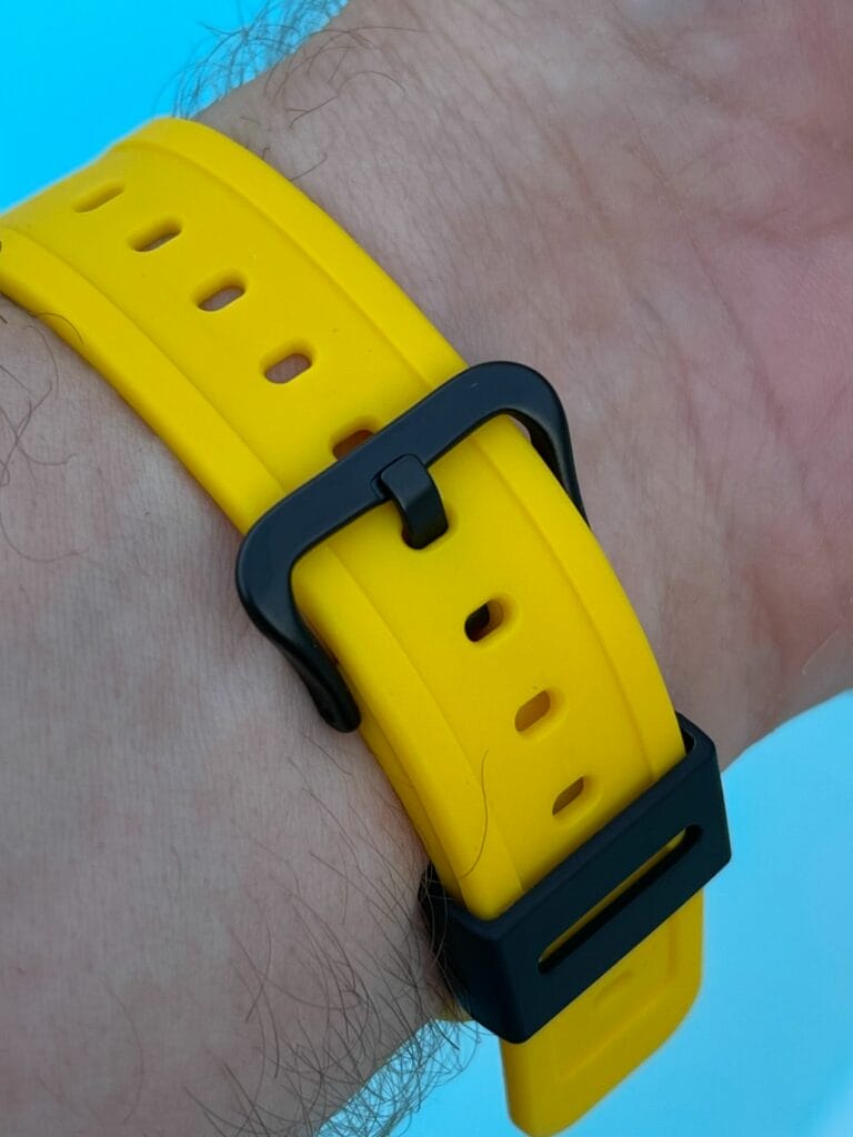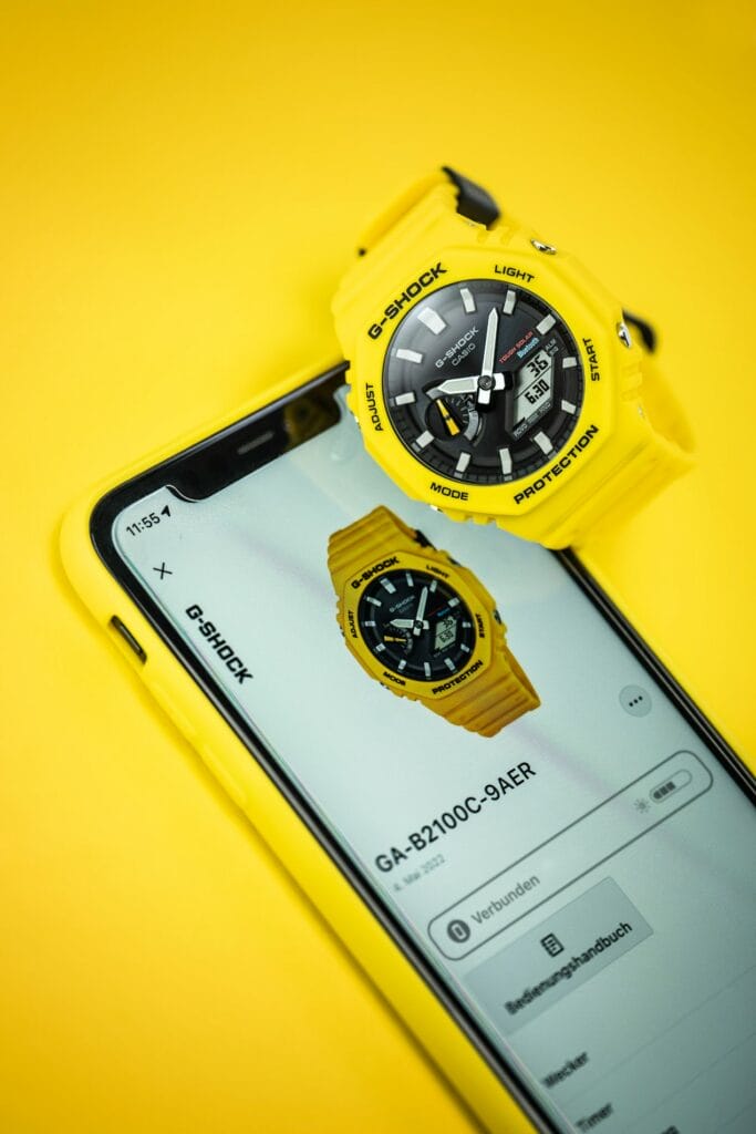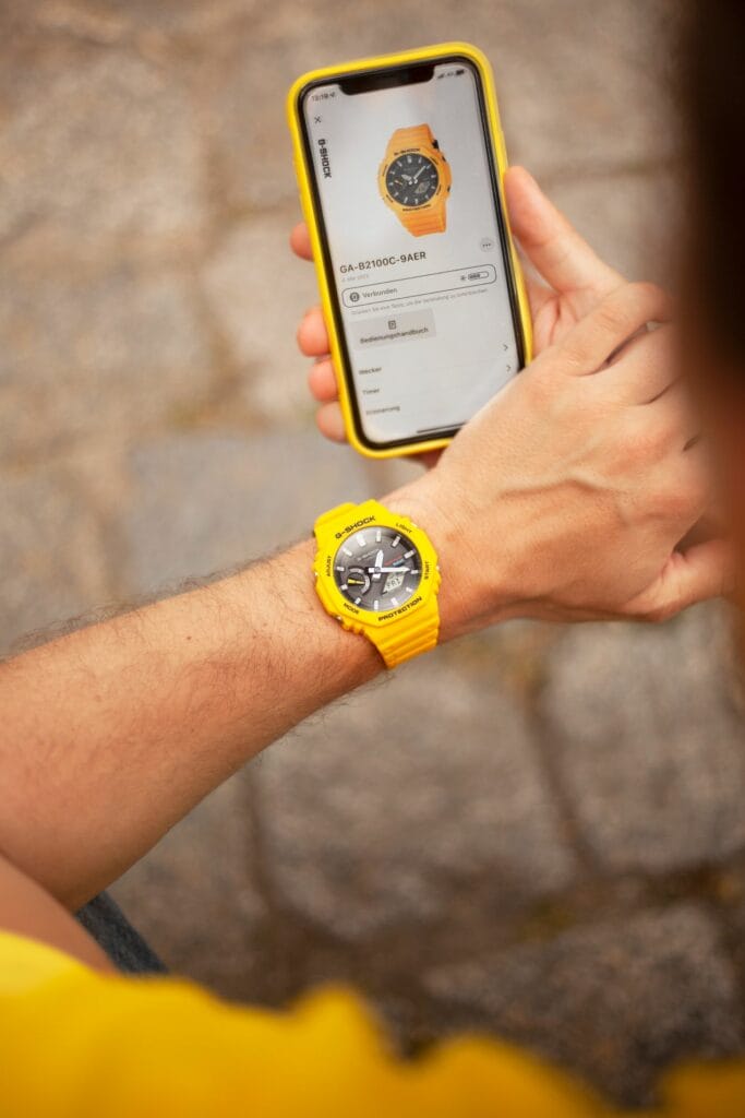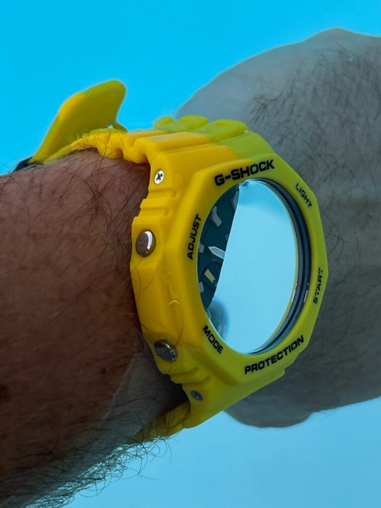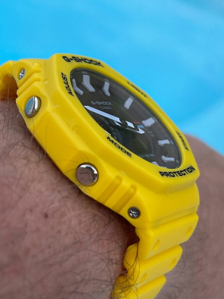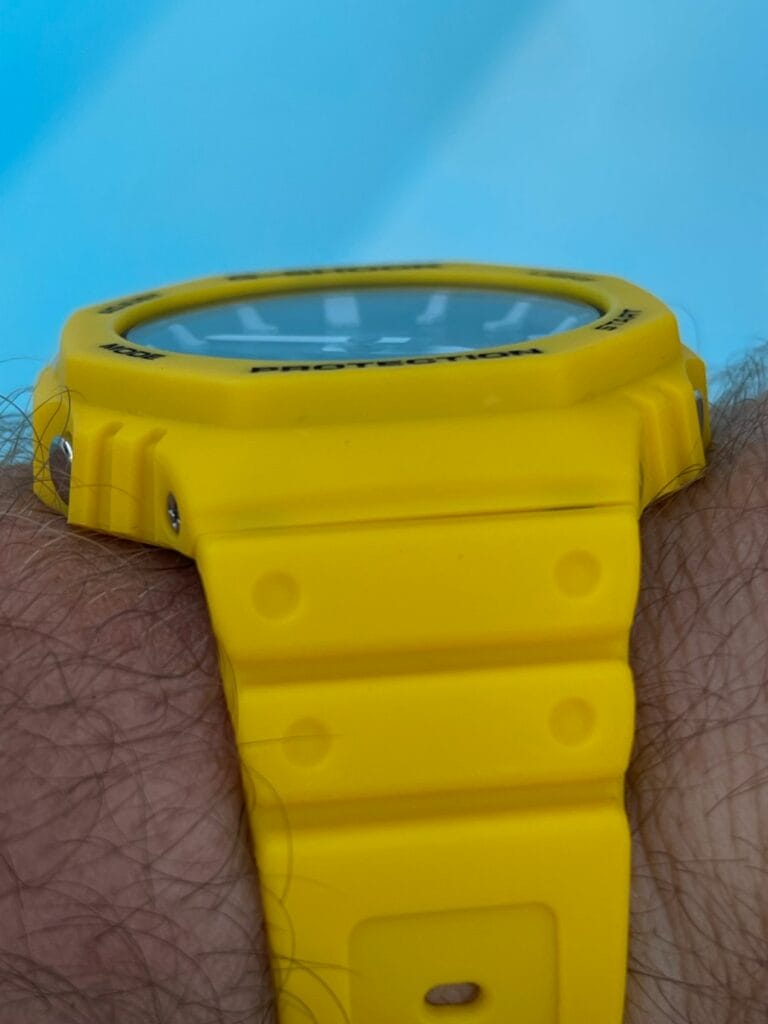 Notre choix s’est donc porté sur le modèle de couleur jaune. Le plus estival ! Mais aussi celui qui colle le plus à la tendance. Actuellement on peut observer de nombreuses montres proposant des cadrans de couleurs vives, et même dans les montres du même segment tarifaire. La MoonSwatch « Mission to the Sun » ou la Citizen Tsuyosa au cadran jaune connaissent également un énorme succès. Mais notre G-Shock GA-B2100C-9AER est le produit meilleur marché, car vendue au tarif de 159 Euro ! Avec même une petite remise en l’achetant en ligne et en s’inscrivant à la Newsletter de la marque.