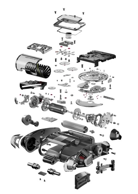 La dernière touche, et non des moindres, portée à la UR-111C réside dans son boîtier. Si sa ligne esthétique rappelle celle de la UR-CC1, l’analogie à l’automobile – futuristique – a été poussée d’un cran – on connaît l’attrait et la fascination d’URWERK pour la Science-fiction et les technologies d’avant-garde. Pour emboîter un tel mécanisme dans un tel boitier dont le corps central est fait d’un seul tenant, il a fallu ruser. L’emboitage se fait donc sur la tranche ! Le boîtier se compose de trois éléments d’un corset central et de deux ailes d’acier. Le mécanisme repose sur le flanc au moment de l’emboitage. Opération délicate et lente. Il s’agit de lui « enfiler » sa carapace d’acier sans effleurer les éléments si fragile du mécanisme horloger. Les finitions du boîtier valent la peine d’être examinées de plus près, sablée, microbillée, poli ou satiné s’alternent en toute harmonie. Ainsi, une simple vis peut à elle seule accueillir différentes terminaisons suivant la face observée. Enfin, pour parachever l’ouvrage, les éléments inhérents à la lecture des secondes sont posés et paramétrés sonnant la fin de ce montage périlleux.