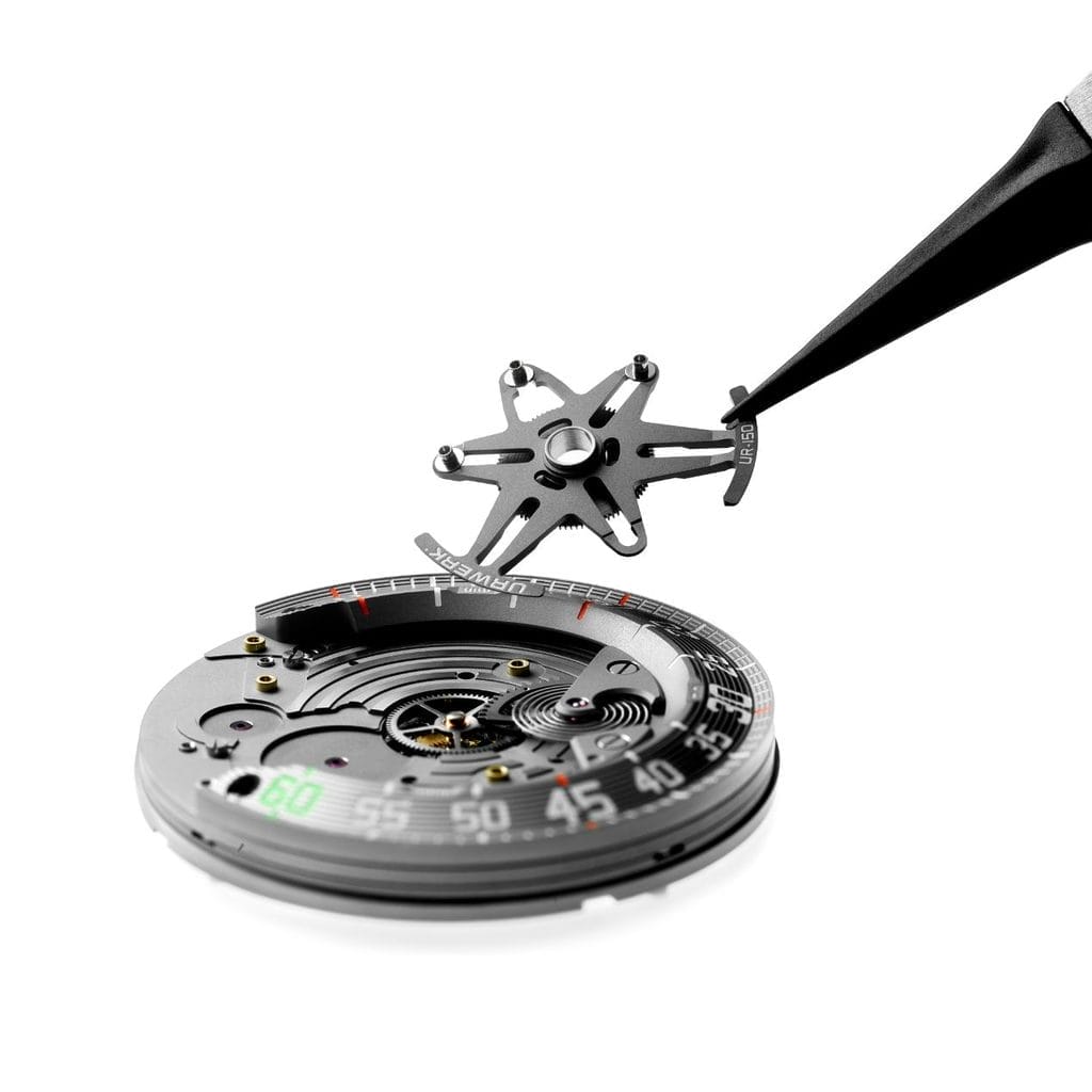 Le mécanisme rétrograde s’inspire de ceux développés pour les automates mécaniques : un carrousel portant les trois satellites des heures suit une came. Cette came, qui régule les mouvements du carrousel, est parcourue en 60 minutes. À la fin de cette période, un ressort URWERK déclenche l’action foudroyante de la UR-150 : l’aiguille rétrograde effectue un saut de 240°, tandis que les satellites des heures pivotent de 270°. « C’est comme un alignement parfait des étoiles, une « Perfect Storm », explique Felix Baumgartner. Pour synchroniser les satellites et l’aiguille des heures, nous avons conçu un nouveau système de complication satellite, intégrant un mobile volant entre les satellites et le mouvement de base. Nous avons remplacé notre système habituel par une came et un râteau, et développé un ressort particulier, fabriqué dans nos ateliers. De plus, pour rendre cette explosion de mouvement plus visible, nous avons élargi la distance entre les index 60 et 0 », conclut-il.