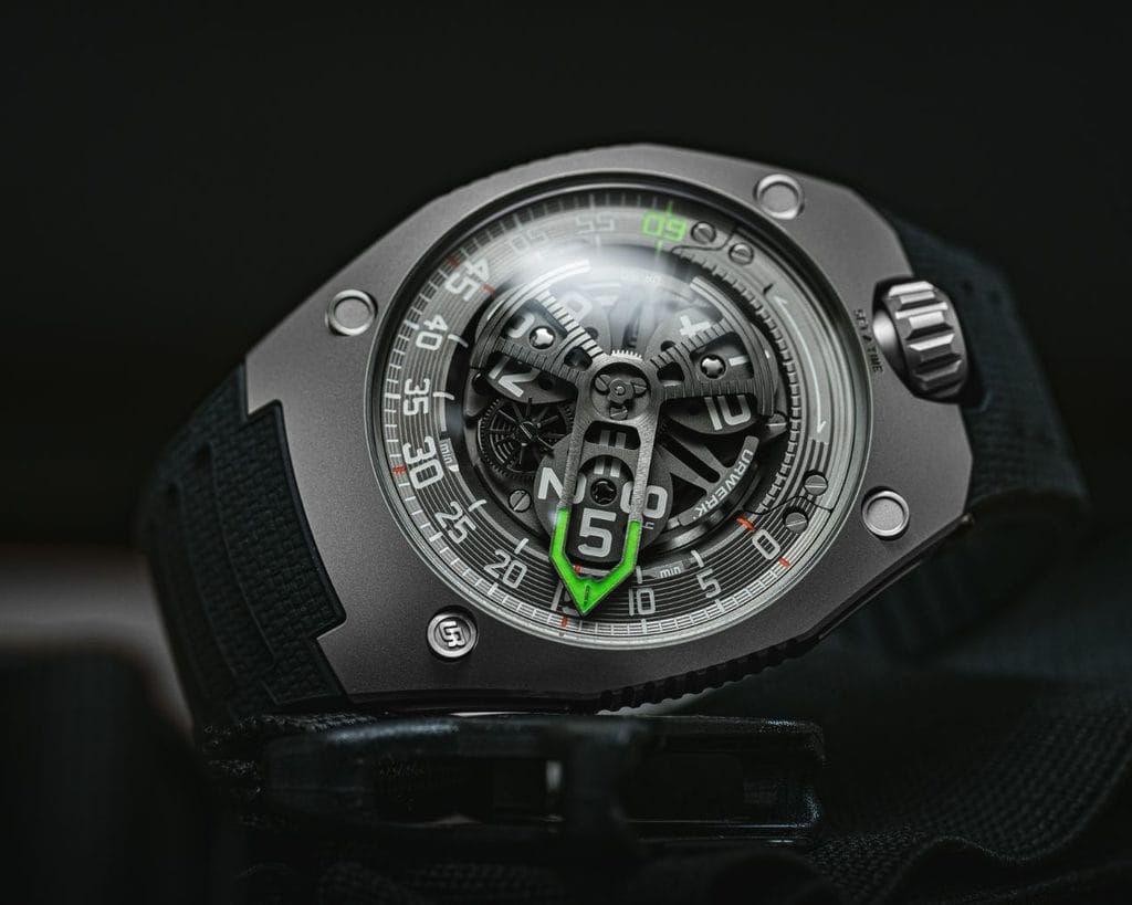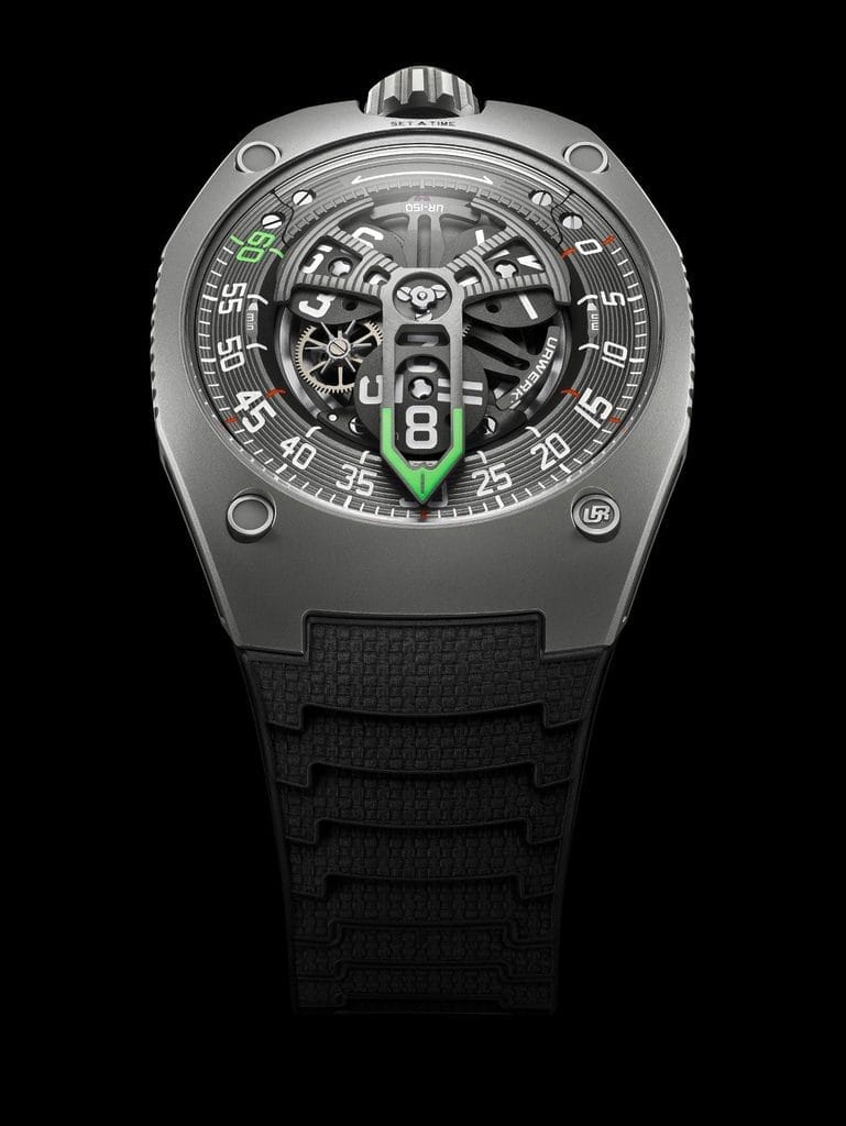 Sur le plan latéral, la UR-150 dévoile un profil courbé où la boîte et le verre saphir se prolongent dans la courbe du bracelet, créant une ligne bombée qui ép épousera les contours du poignet. Cette courbure va au-delà du design extérieur et s’étend au mouvement, avec des satellites et l’aiguille des heures également inclinés. « Avec la UR-150, l’heure se lit sans avoir à tordre le poignet. Le présent se dresse devant nous et nous confronte. Chaque détail compte, c’est un jeu de positionnement. La tension entre la douceur et la dureté de la mécanique donne son énergie à la UR-150 », souligne Martin Frei. Il ajoute : « L’harmonie ne m’intéresse pas ; la beauté émerge de la contradiction ! »