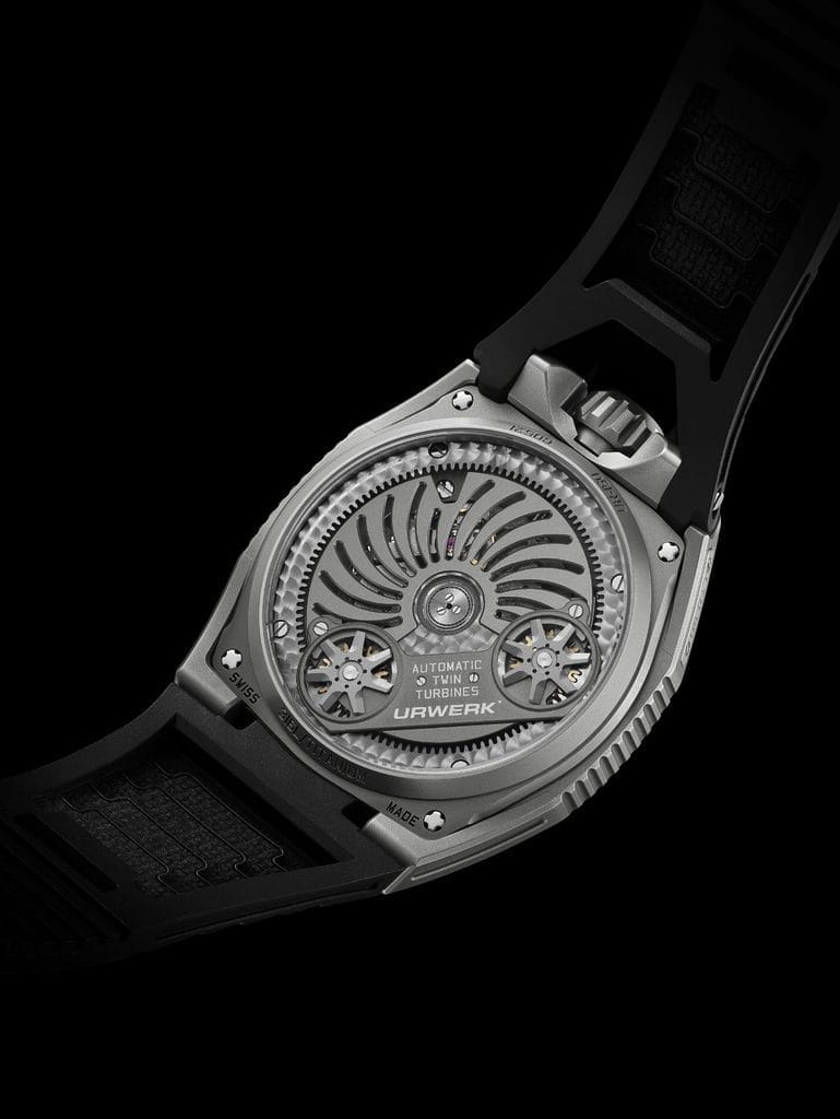 Parmi les innovations de la UR-150, le remontage automatique, régulé par un double jeu de turbines, atteint un nouveau niveau. Ce rotor plein présente un profil énergétique et antichoc novateur. « Les turbines sont conçues pour absorber les chocs sur le rotor, évitant que ce soit l’axe qui les subisse. »