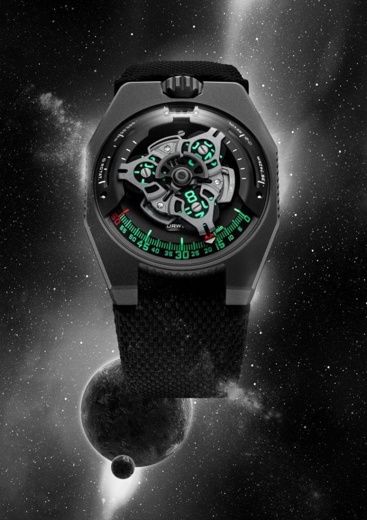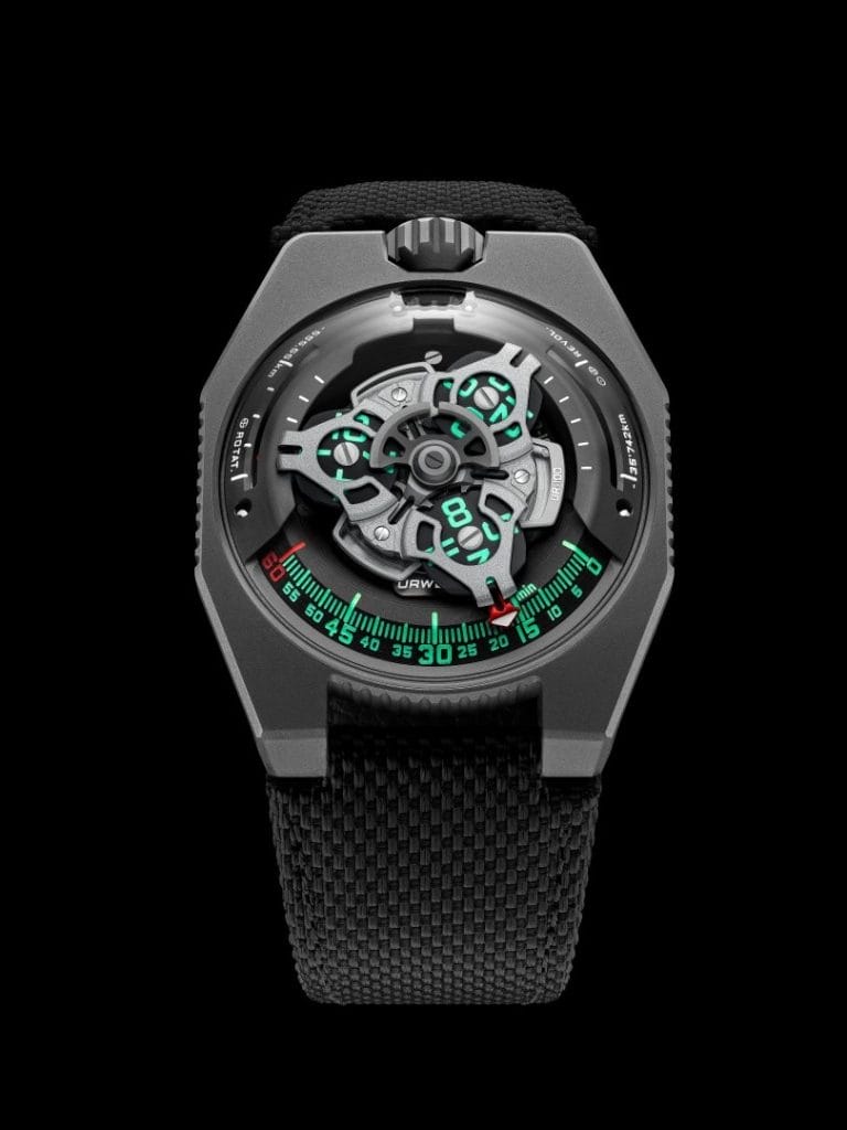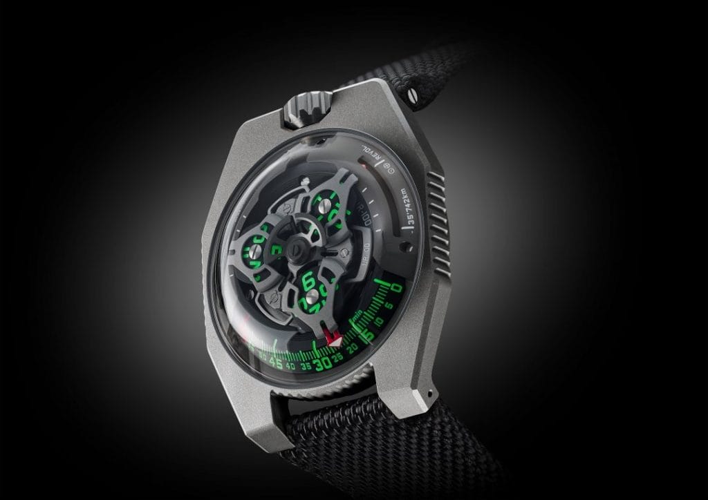 Sur la UR-100 GunMetal, à l’affichage des heures et minutes par le biais de satellites, s’ajoute une nouvelle information. L’aiguille des minutes, une fois passé le cap de la 60ème minute disparait pour réapparaître comme compteur de kilomètres. Elle vient illustrer les 555 kilomètres parcourus toutes les 20 minutes par tout habitant de la Terre. C’est en effet, en moyenne la vitesse de rotation de la Terre calculée au niveau de l’Equateur. A son exact opposé, vient s’afficher une autre donnée, la révolution de la Terre autour du soleil, soit 35’740 kilomètres par 20 minutes. Sur la face de la UR-100 GunMetal, heures et kilomètres partagent ainsi un même statut, une même échelle de valeur. Ces unités s’illuminent en vert incandescent pour la lecture des heures et en blanc flamboyant pour les kilomètres. Felix Baumgartner, maître horloger et co-fondateur d’URWERK nous dit : « Cette création est inspirée d’un cadeau reçu de mon père, Geri Baumgartner, restaurateur renommé de pendules anciennes. Il s’agit d’une pendule fabriquée par Gustave Sandoz pour l’exposition universelle de 1893. Sa particularité : plutôt que les heures, elle indique la distance parcourue par la Terre au niveau de l’Equateur ». Martin Frei, designer et co-fondateur d’URWERK, a bataillé pour imposer cette indication sur les cadrans de la UR-100 « A mes yeux, une montre est une reproduction à la fois physique et abstraite de notre situation sur la Terre. Elle nous ancre à un moment et une longitude précise, tout en étant le témoin de l’éphémérité de cette position.»