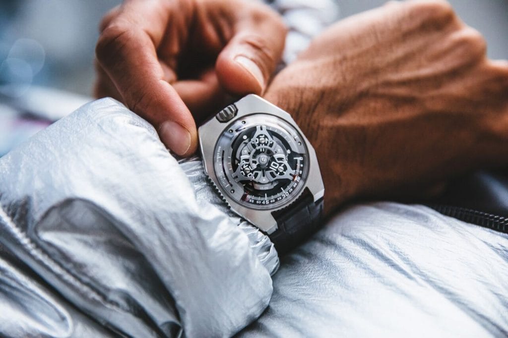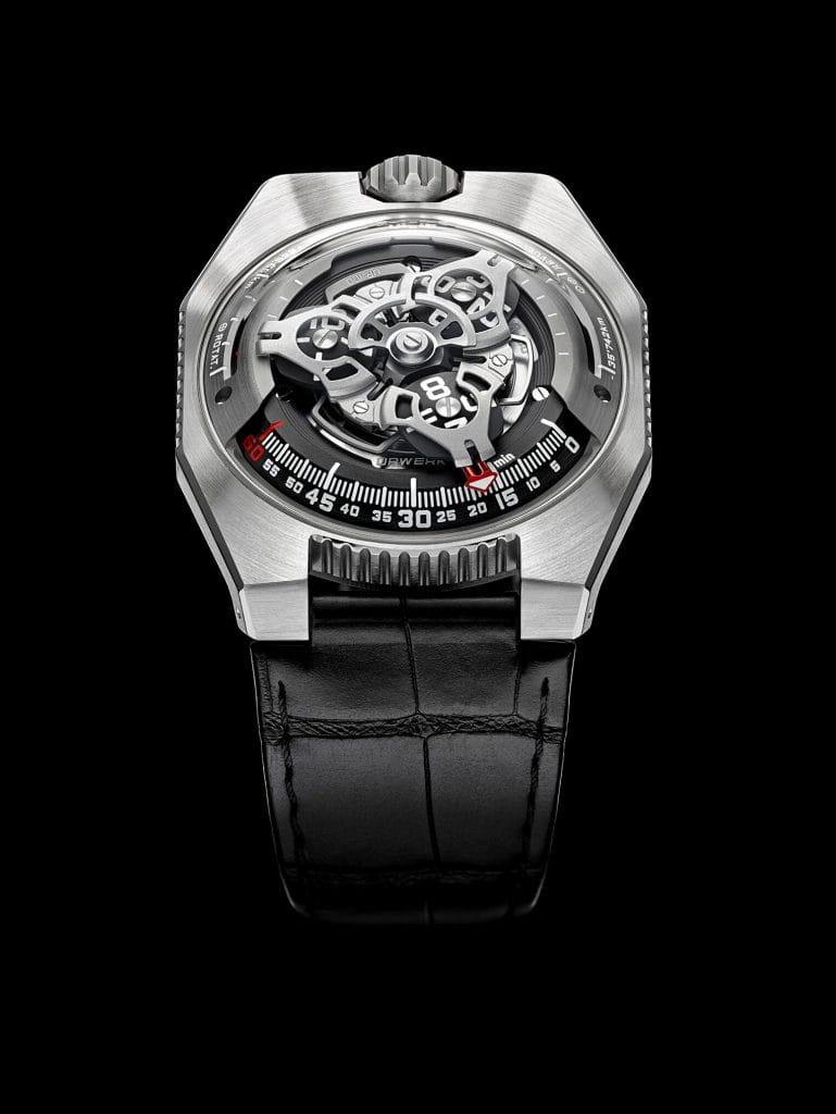 L’esthétique du boîtier de la UR-100 suscite un plaisir régressif. En effet, il remémorera aux fidèles d’URWERK l’esthétique des premiers modèles de la marque indépendante : « Vers la fin des années ’90, nous dévoilions nos UR-101 et UR-102. Cette UR-100 est un peu notre Retour vers le Futur » déclare Martin Frei. « Nous avons repris certains anciens éléments de nos premières constructions et avons déstructuré notre approche. Le boîtier de la UR-100 est la déconstruction d’un boitier URWERK existant. Le dôme d’acier de nos modèles historiques est ici reproduit en toute transparence, en verre saphir. Sa perfection est mise en relief par les aspérités de la boîte titane et acier. Pour moi qui questionne sans cesse le diktat de la symétrie, j’ai joué des proportions pour interpeler le regard. »
