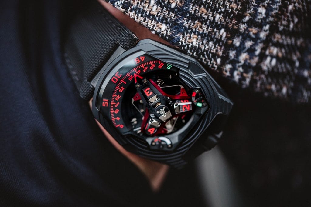Le succès de la UR-210 ne se dément pas. C’est une montre spectacle qu’il faut voir en action pour en mesurer tout l’attrait. Garder votre attention rivée sur son cadran et éviter de cligner des yeux. En un dixième de seconde, son imposante aiguille rétrograde survolera la distance séparant le marqueur des 60 minutes du marqueur 0 dans un grand « clac » sec. Une force brute et pourtant diablement maîtrisée.