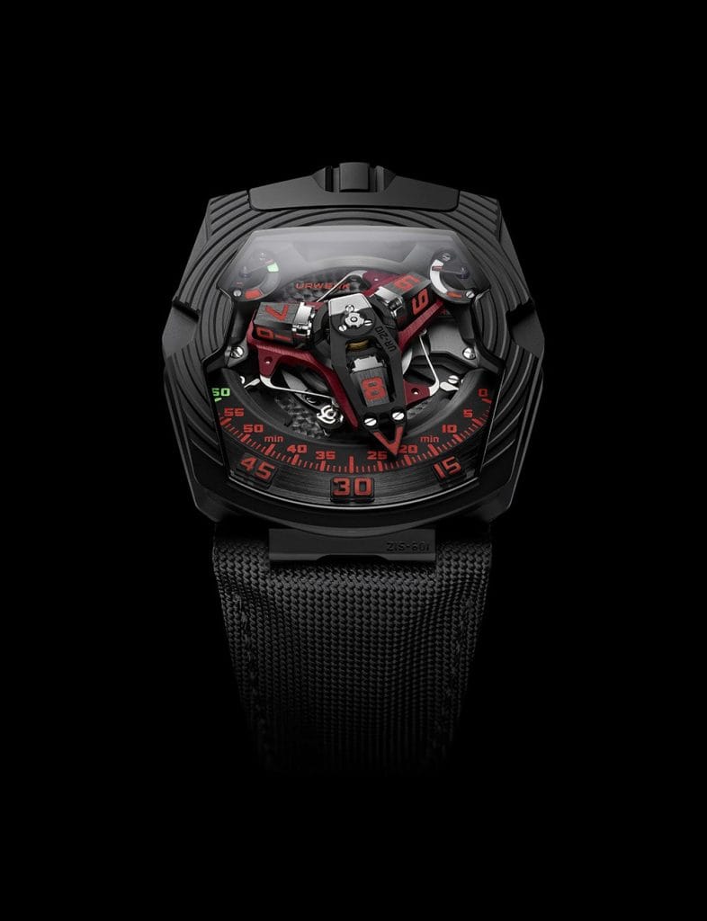 La complication satellite avec minute rétrograde de la UR-210 est à la fois originale et totalement détonante. En vedette, une aiguille des minutes 3D aux proportions hors norme qui se présente tel un carénage high-tech. Sa fonction est d’enserrer le plot des heures tout au long de son voyage sur le rail des minutes. Ce voyage temporel d’une heure, ce glissement de 60 minutes sur un arc de 120° se fait sans à-coup. Ce système rétrograde d’une rapidité foudroyante s’appuie sur trois éléments-clé :