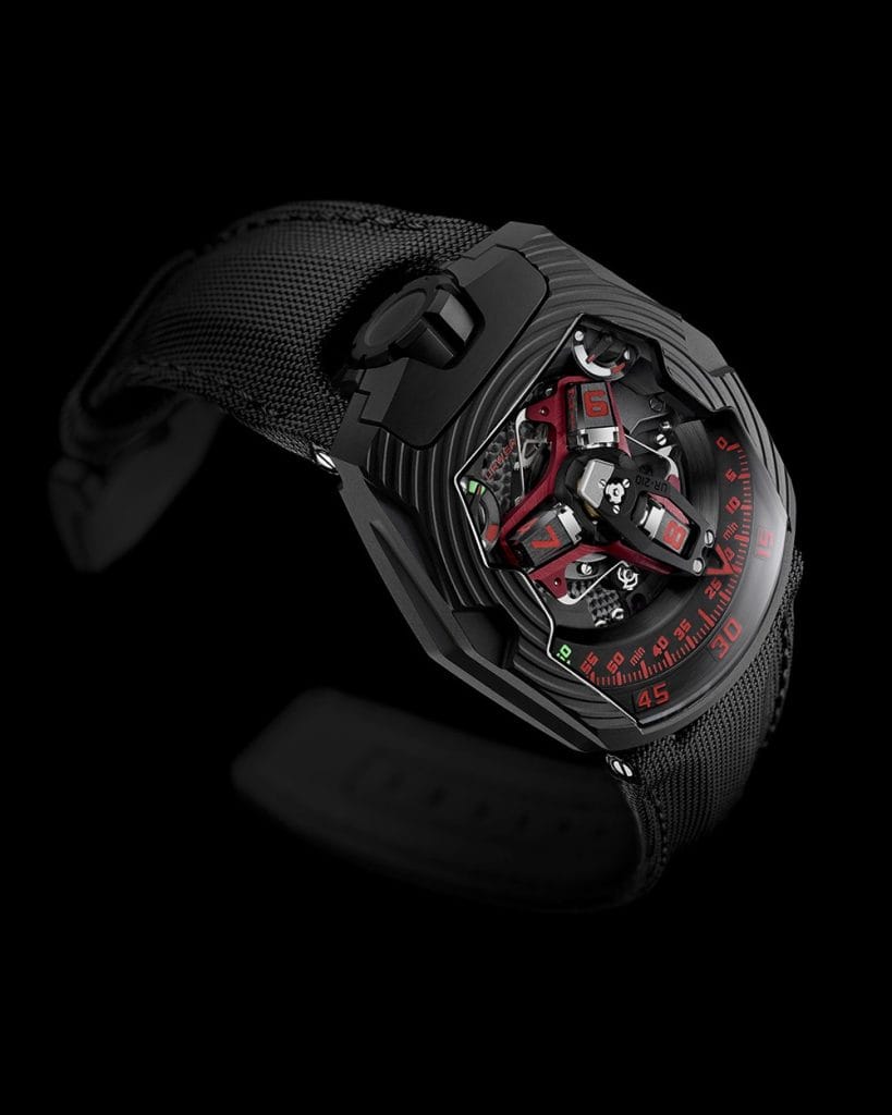 La complication satellite avec minute rétrograde de la UR-210 est à la fois originale et totalement détonante. En vedette, une aiguille des minutes 3D aux proportions hors norme qui se présente tel un carénage high-tech. Sa fonction est d’enserrer le plot des heures tout au long de son voyage sur le rail des minutes. Ce voyage temporel d’une heure, ce glissement de 60 minutes sur un arc de 120° se fait sans à-coup. Ce système rétrograde d’une rapidité foudroyante s’appuie sur trois éléments-clé :